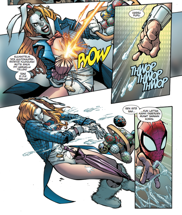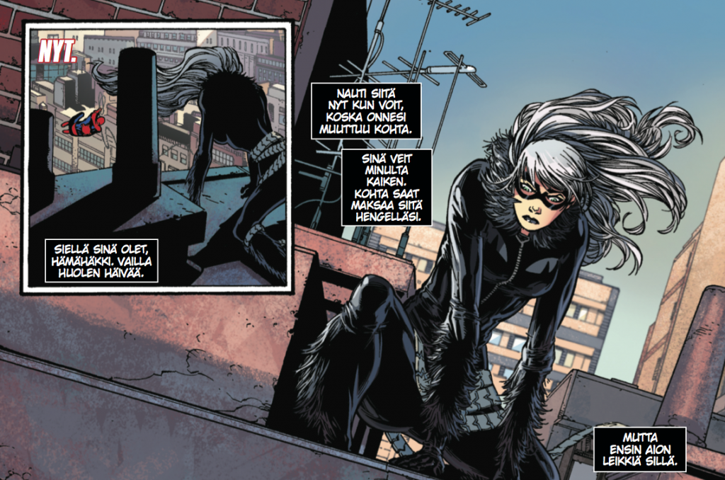 Jotta touhu ei menisi yleiseksi koheloinniksi ja ihmissuhdeihmettelyksi, niin Hämiksen vanhoista vihollisista Elektro osoittaa vakavan aktivoitumisen merkkejä, joiden seurauksen eräskin Felicia Hardy pääsee luikahtamaan vapaalle jalalle ja vieläpä Peter Parkerin kannalta erittäin ikävissä aikeissa. Ainakin allekirjoittanut odottaa seuraavaa numeroa vesi kieleltä valuen, eikä se siis ole pelkästään Mustan Kissan ansiota.