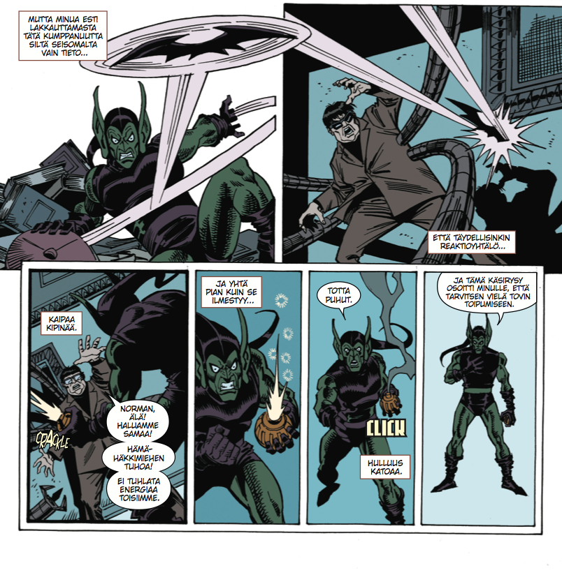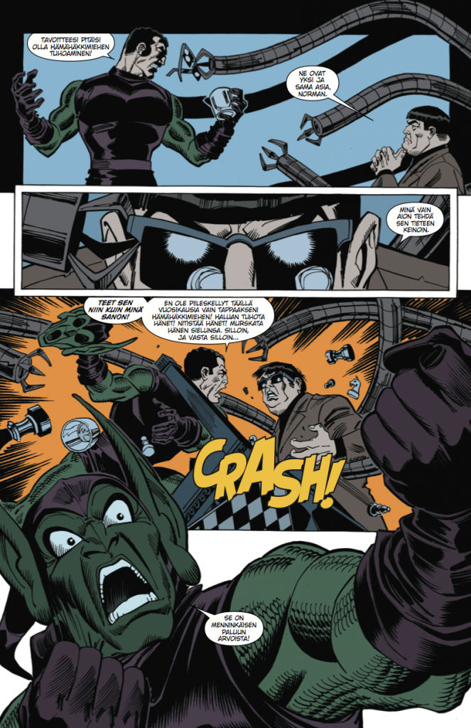 Käsikirjoituksesta vastaava Kevin Shinick tekee siis parhaansa valaistakseen superkonnien sisäistä logiikkaa ja tunteen paloa. Ron Frenzin ja Marco Checchetton vanhan koulukunnan kulmikas kuvitus pysyttelee kärryillä mielipuolisten päähenkilöiden mökötysten ja virnistysten tulvassa. Näillä tyypeillä todellakin vilkkuvat valot vintillä. Ja sivulliset kärsivät. Ja juuri viattoman sivullisen kärsimys on Otto Octaviuksen oljenkorsi, johon takertumalla hän lunastaa itsensä ainakin Peter Parkerin silmissä.