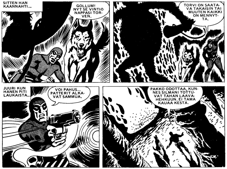Toukokuun lopussa ilmestyvässä vuoden 1974 kokoelmassa joudumme luopumaan aivan kaikkien kyseisen vuosikerran Mustanaamio-tarinoiden uusimisesta, eli mukaan on valikoitu parhaat ja mielenkiintoisimmat jutut. Osa alkuperäisen materiaalin painojäljestä on sen verran rujoa, että tämä päätös oli pakko tehdä. Kaksi tuhtia kirjaa puolittain lukukelvotonta sarjakuvaa olisi ollut kenties kovimpien kompletistien mieleen, mutta tarkoituksemme on kuitenkin tarjota viihdettä koko rahalla. Ja sitä todellakin on luvassa!