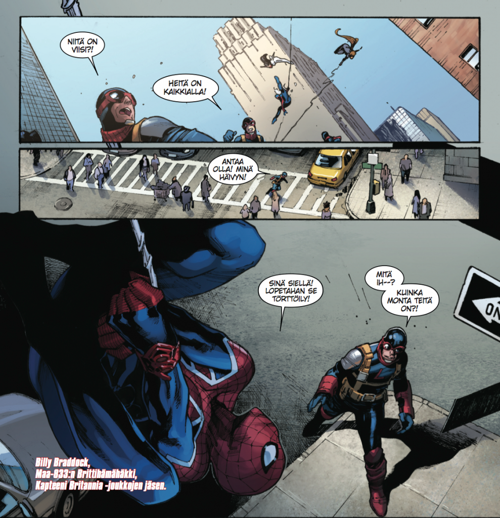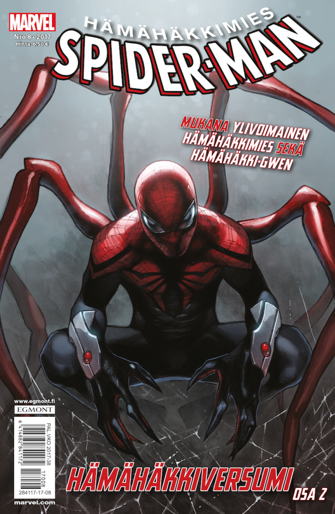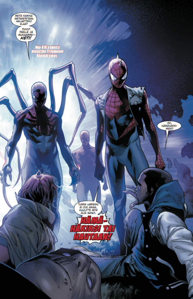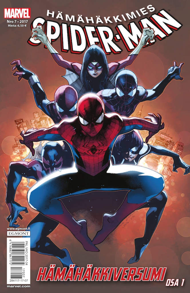 Hämähäkkimiehen numerosta 7/2017 käynnistyvä Hämähäkkiversumi puolestaan on tämän… öh… sanotaan nyt vaikka pienimuotoisuuden vastakohta. Käsikirjoittajavelho Dan Slott ottaa käsittelyynsä Marvelin universumin mahdollistat kosmiset kuviot, eli kamppailu siirtyy kahden mielen välisestä valtakamppailusta vaihtoehtoisten maailmojen hämähäkkivoimaisten olentojen ja Perijöiksi kutsutun hämähäkeistä elinvoimansa saavan sadistisen ja luonnollisesti erittäin supervoimaisen aatelisperheen väliseksi sodaksi. Kun kaksi tai kolme Hämähäkkimiestä ei riitä ja yksi pahis ei ole tarpeeksi…