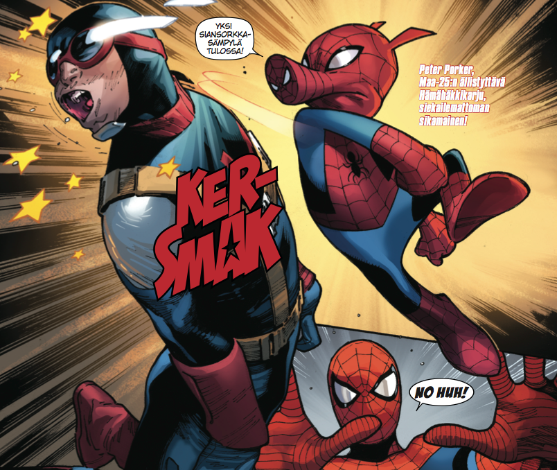 Eli ottakaa ihmeessä Hämähäkkiversumista koppi! Parasta mahdollista Marvelia. Vähintäänkin elokuvien veroista viihteen ilotulitusta. Lopuksi vielä iso käsi, eli kosmisen mittaluokan aplodit Rami Rautkorvelle, joka on tehnyt melkoisen savotan sekä kääntäjänä että toimittajana valitessaan Hämähäkkiversumiin liittyvät alkuperäisjulkaisut. Odottelemme täällä sometoimituksessakin tarinan jatkoa kieli vyön alla…