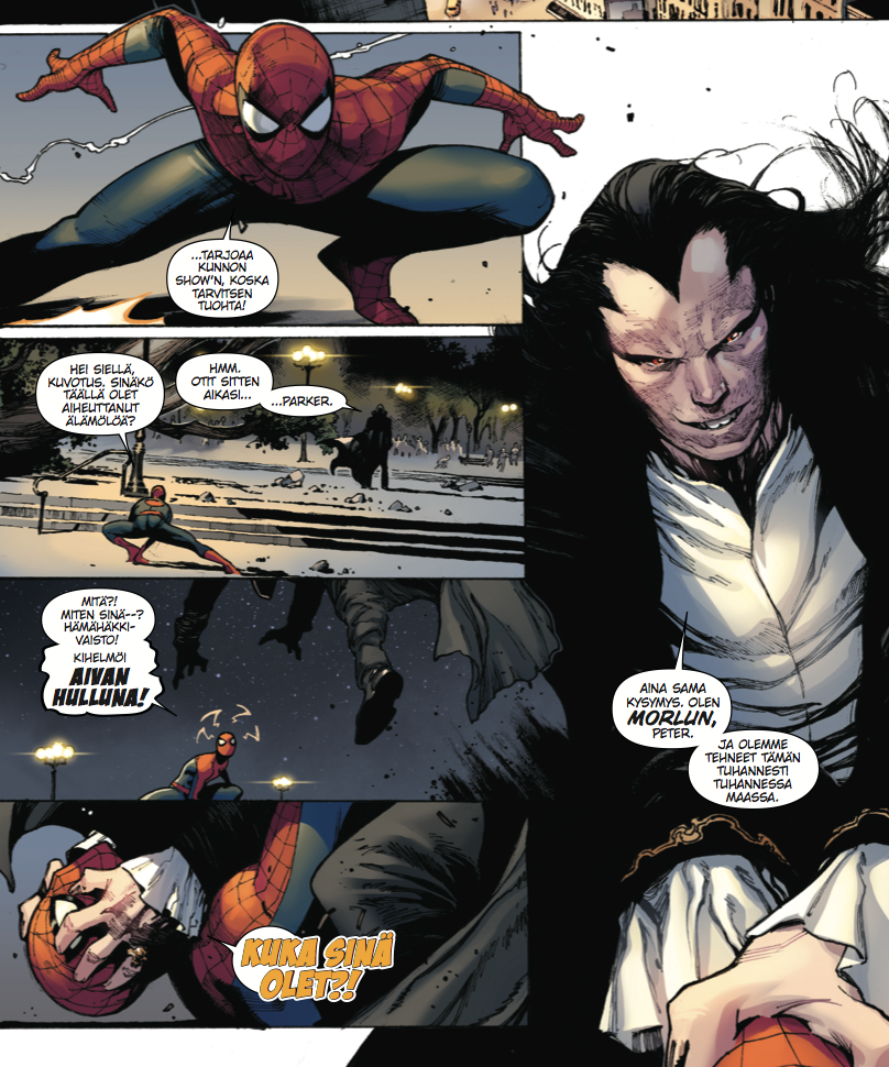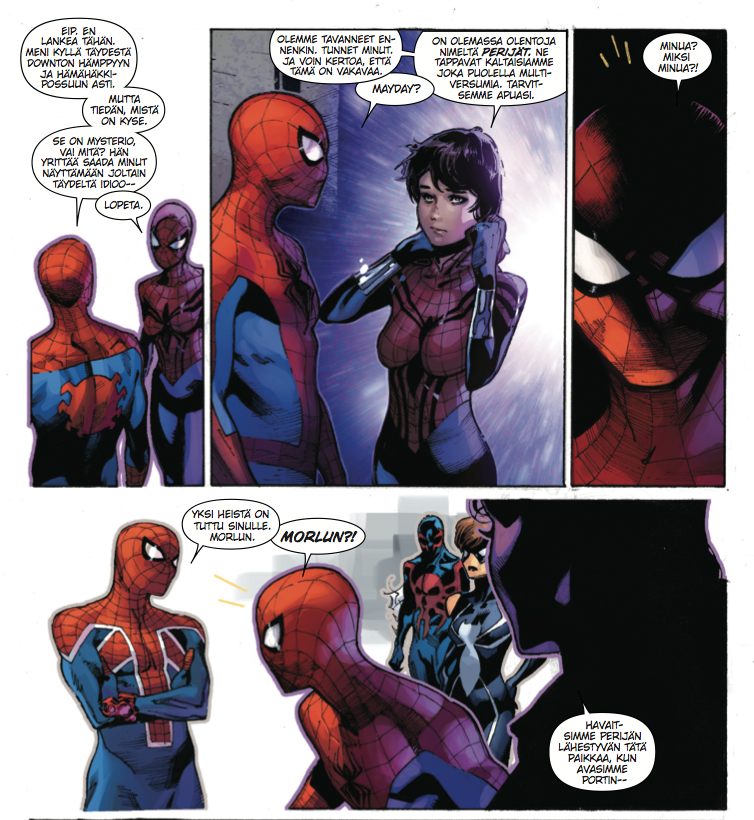 Lukijoita hemmotellaan siis laittamalla samaan pakettiin lukemattomista erikoisjulkaisuista tuttuja vaihtoehtoisia Hämähäkkimiehiä, -naisia ja -eläimiä. Näitä sankareita ja sankarittaria laitetaan tosin pakettiin myös sanan toisessakin merkityksessä, eli Morlun perheineen pistää seittisankareita kylmäksi häijyllä tehokkuudella.
