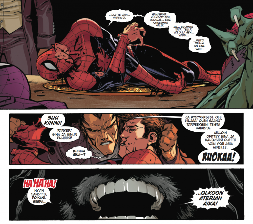 Sen verran on kuitenkin pakko spoilata, että elokuun numerossa kuvioihin palaa eräs vanha tuttu Hämähäkkimiehen vermeiden avulla moraalisen selkärankansa löytänyt Peter Parkerin verivihollinen. Perijöitä vastaan kaikki mahdollinen taustatuki onkin tarpeen!