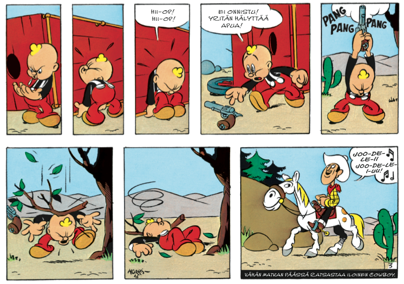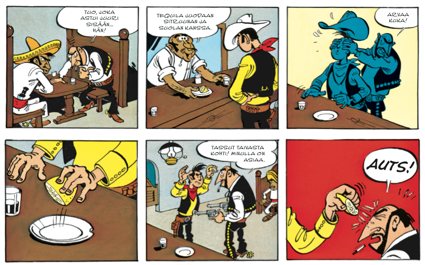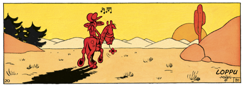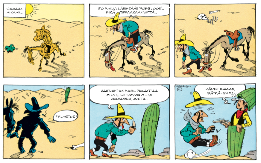 Siitäkin on jo muutamahko vuosi, kun tämän artikkelin kirjoittaja väsäsi ala-asteen esitelmän Lucky Lukesta ja sen tekijästä. Toisen omaan muistiin jäljen jättäneen esitelmän aihe oli sioux-intiaanien kulttuuri, joten Villi länsi todellakin oli lähellä pienen Tuomion sydäntä. Sen myötä tuntuukin kunniatehtävältä hehkuttaa tätä lännensarjakuvan merkkipaalua täällä blogissa. Kasvuiässä nautitut Lucky Luket, Tex Willerit ja Kuukauden westernit näkyvät yhä tämän sarjakuvatoimittajan touhuissa pukeutumista myöten.