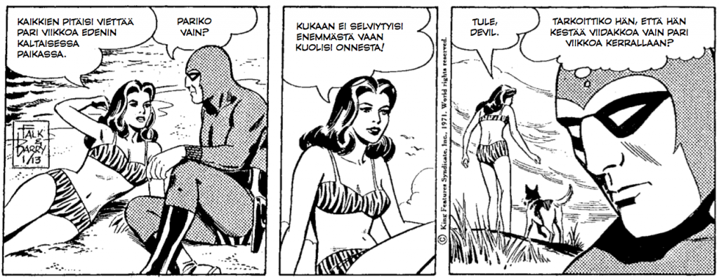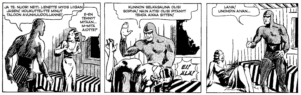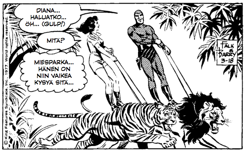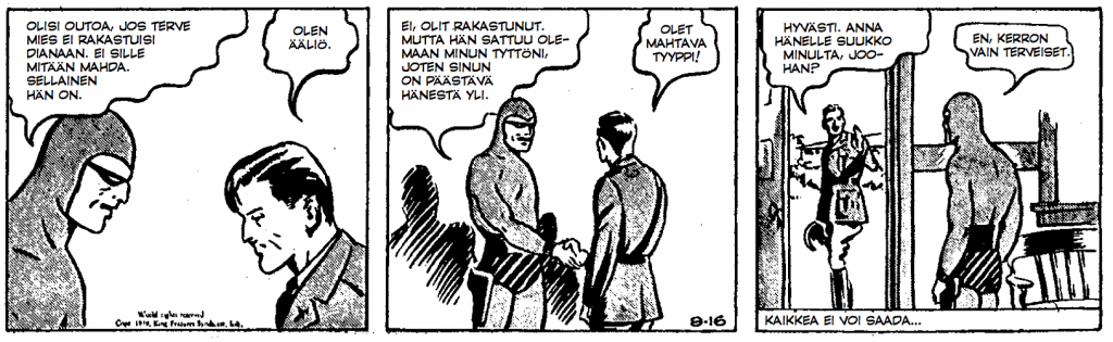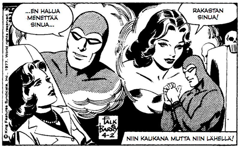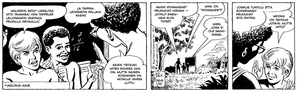 Vaikka alkuaikojen Mustanaamio olikin hanakka mies pussaamaan ja tuntui muutenkin tietävän mitä tahtoo, niin aika pian Vaeltavasta aaveesta kuoriutui omaan ujouteensa tikahtuva viidakon herrasmies.