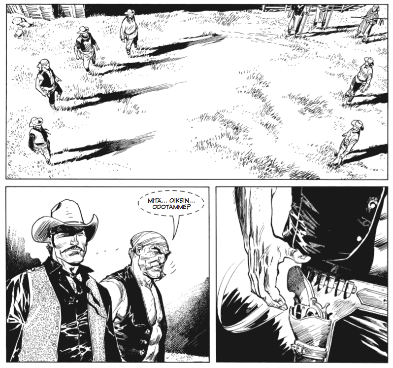 Sokerina pohjalla Sergio Leonen malliin tunnelmoiva ja viipyilevä kuusintaistelu. Kyllä, kuusintaistelu. Kaksi vastaan neljä lienee kuusintaistelu, eikö?