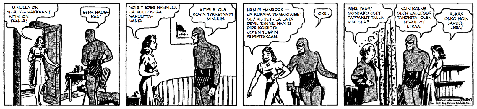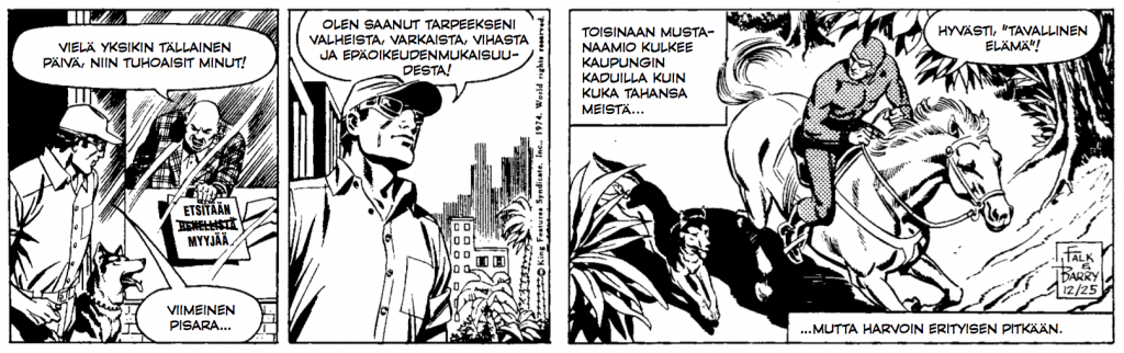 Lopputulema on siis se, että tavallinen elämä ei ole Mustanaamion juttu. Jännitettäväksi siis jää kuinka Diana suhtautuu sulhaseen, joka ei pysty tarjoamaan normaalia harmaata arkea, joka jostain syystä tuntuu olevan sankarimme mielestä naisille kaikki kaikessa. No oppiipahan…