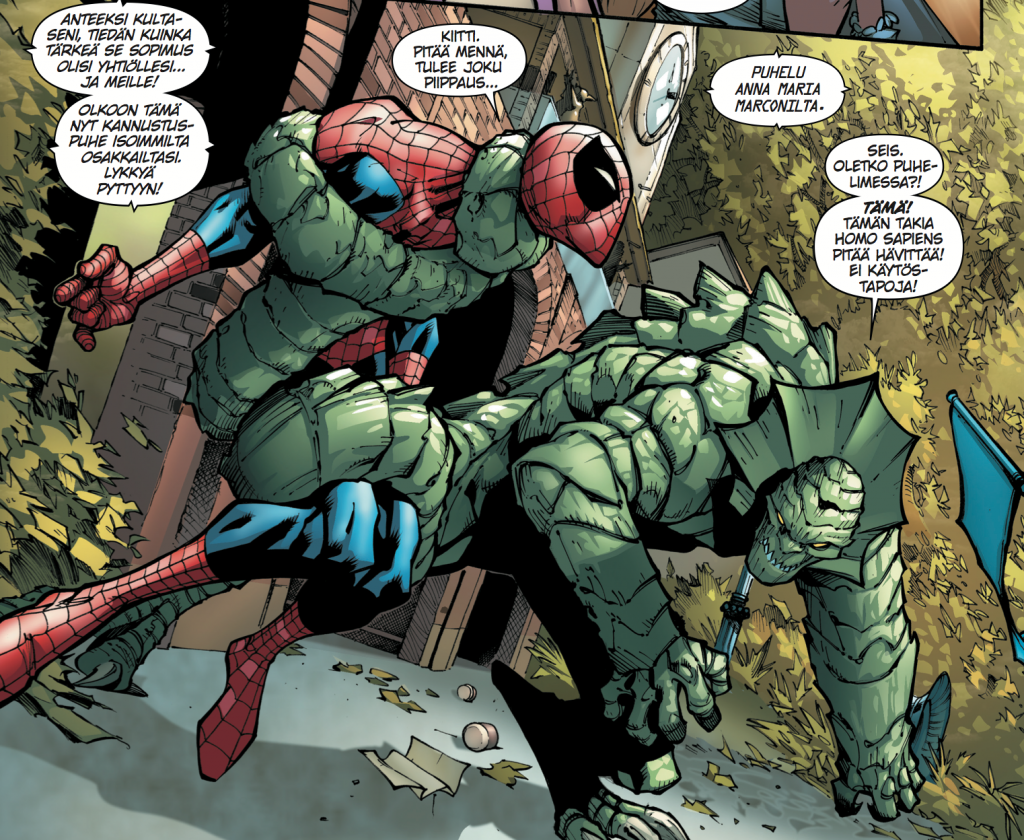 Ensimmäisessä numerossa vedämme henkeä. Tavallaan. Aloitamme keskeltä tappelua ja siirrymme sitten arkielämän myrskyihin. Jos tarkkoja ollaan, niin Hämis yrittää luovia arkikuvioita kesken tappelun. Seittisankarimme palautuminen Hämähäkkiversumin rytinästä on pahasti kesken ja kirsikkana kakussa Otto Octaviuksen keikka Hämähäkkimiehenä hankaloittaa yhä Peter Parkerin arkikuvioita.