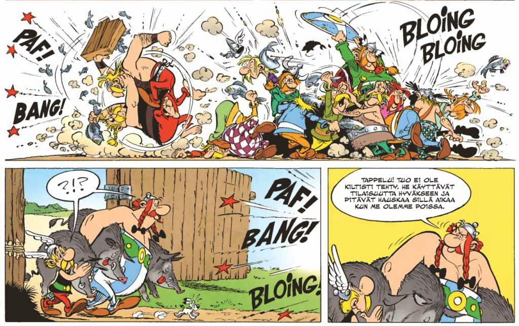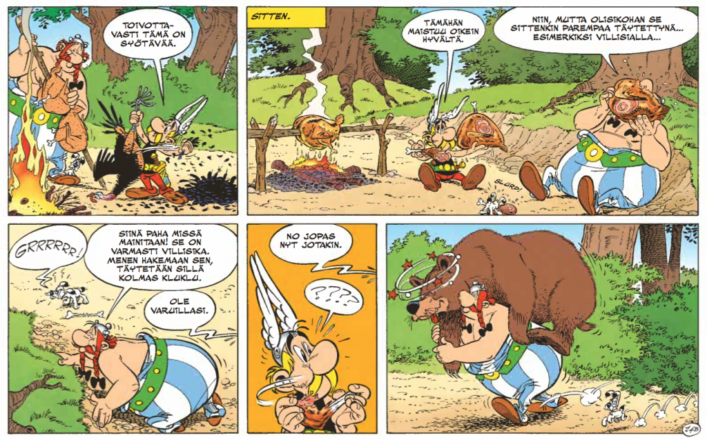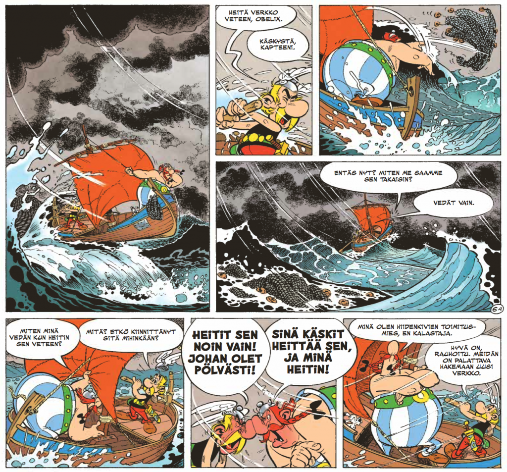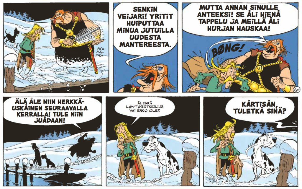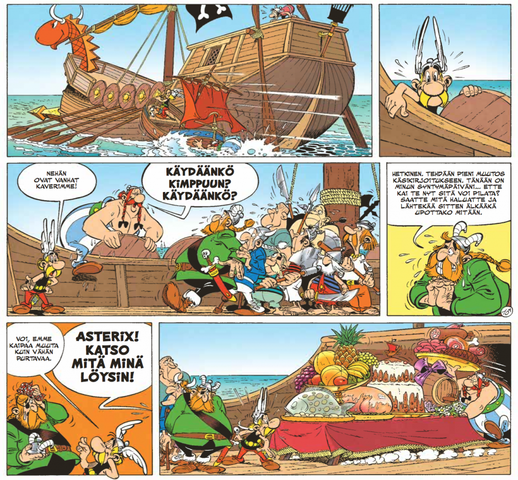 Onneksi leijonan aikaan paikalle karahtavat viikingit tarjoavat paluukyydin. Viikingit ovat muuten albumin aikoinaan ajankohtaisimpia vierailijoita, sillä albumin ilmestymisen aikoihin viikinkien vierailu Amerikan mantereella kauan ennen Kolumbusta aloitti oman matkansa saagojen usvasta kohti täysin varmasti todistettua faktaa myös laajemmassa tietoisuudessa. Todellisen maailman ja Asterixin aikajanat menevät tässä kohtaa melkoisen villiä siksakkia, mutta onpahan muun muassa Hamlet-viitteitä bongattavana ja paljon hupia Å:sta Ø:hön. Huumorisarjakuvan raskasta sarjaa, vaikka omassa kaanonissaan onkin hieman kevyempi remellys.