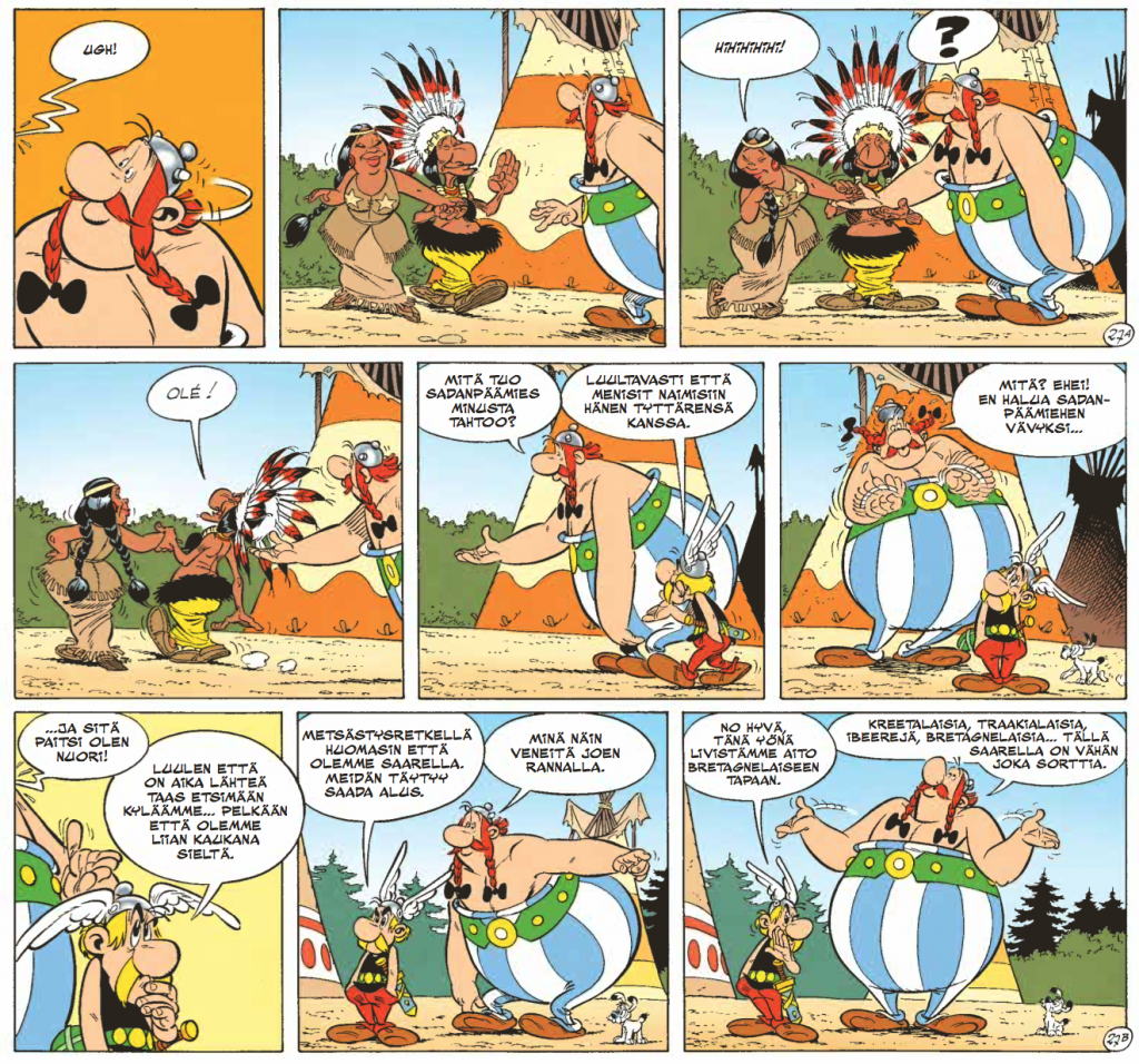 Alkukahnauksien jälkeen Asterix ja Obelix sopeutuvat elämään maalattujen ja sulkakoristeltujen ”roomalaisten” kanssa oikein mainiosti.
