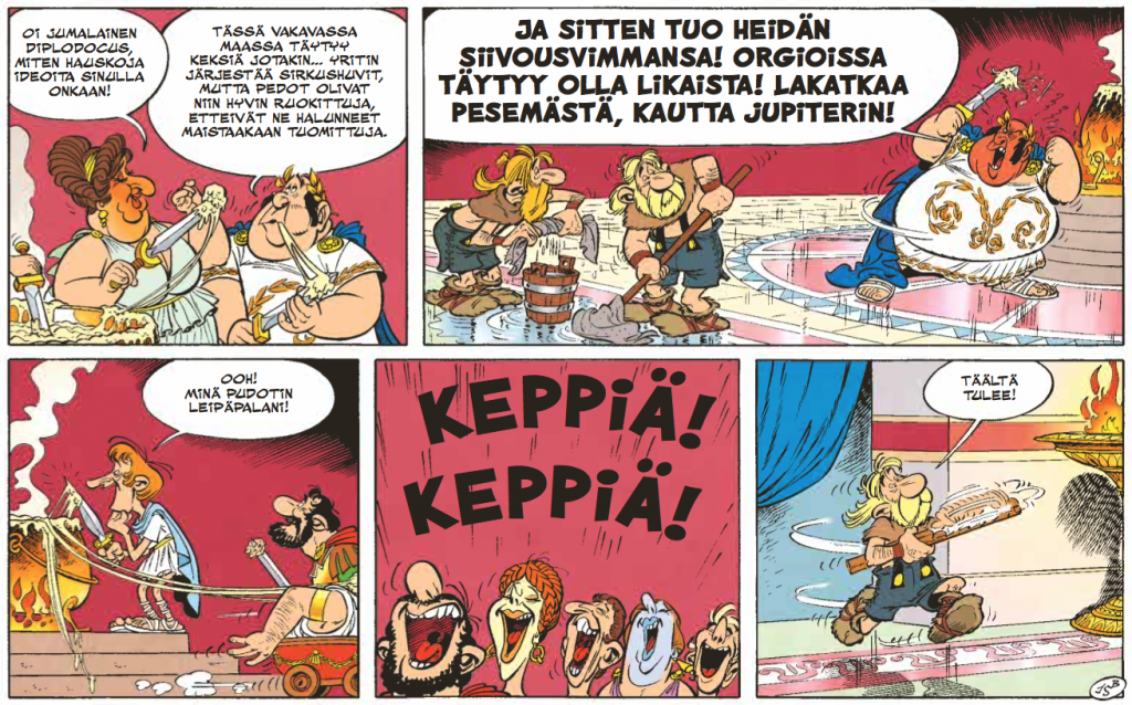 Asterixia aikuisen makuun! Kuudestoista Asterix ei ansaitse K16-leimaa kylkeensä, vaikka sisältääkin runsaasti orgioita, väkivaltaa ja ruoskimista. Orgiat nimittäin tapahtuvat alkuperäisen merkityksensä puitteissa, eli mässäilystä siis on kyse. Siitäkin huolimatta meno on sangen rätväkkää. Kuppiakin kallistellaan ahkerasti sekä gallien että roomalaisten toimesta…