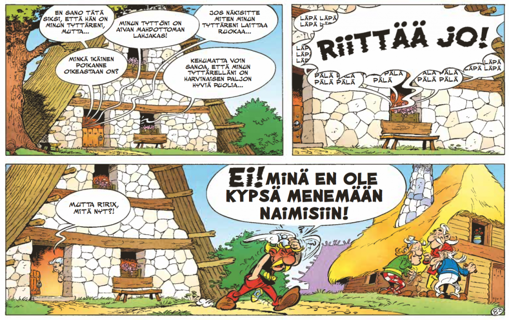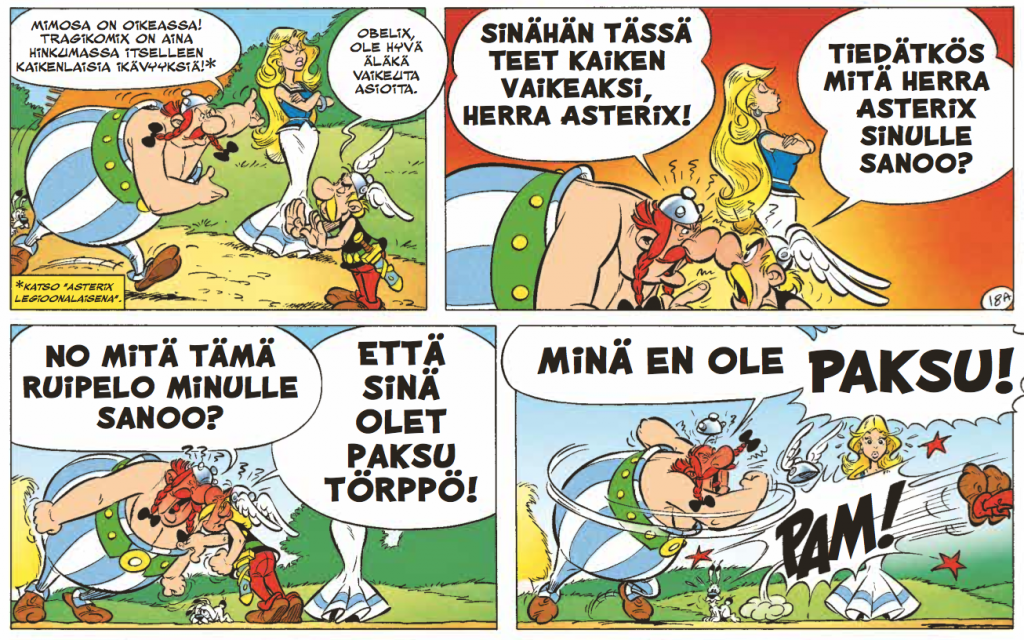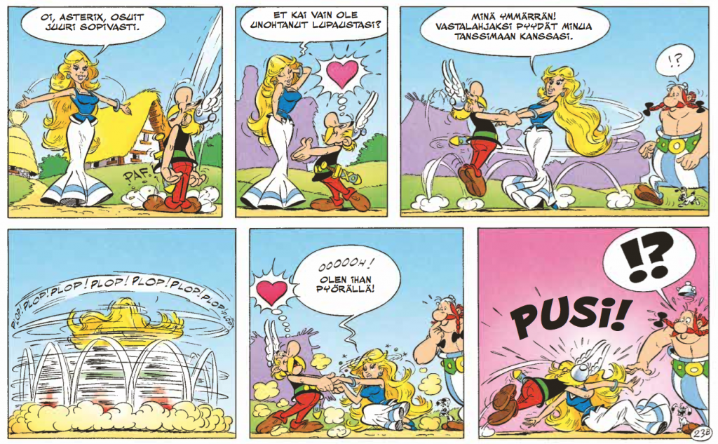 Uderzo käyttää siis kaksin käsin hyväksi päähenkilökaksikon heikkoutta naiskauneudelle. Teinihenkiset tunnekuohut johdattavat kaverukset tukkanuottasille ja pian Obelix kolhiikin Asterixilta tolkun pois.