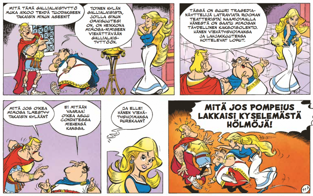 Koskapa Albert Uderzo ei ole käsikirjoittajana Rene Goscinnyn kaltainen supervelho, niin elämää suurempia teemoja ja syväluotaavia katsauksia ihmisyyteen ei ole luvassa. Ikisinkkujen sitoutumiskauhistelu vaihtuukin salamana yleiseen slapstick-kohkaukseen, kun roomalaiset keksivät hämmentää voittamattoman gallialaiskylän kuvioita lähettämällä agentikseen kuvankauniin Mimosan yhtä kauniin kaksoisolennon.