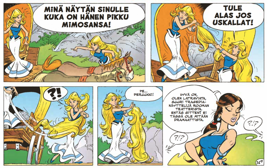 Ja kuten jo varmaan arvasittekin, niin ne sokerit pohjalla ovat Mimosa ja Latraviata. (Kyllä, kirjoittajan logiikassa on nyt puolueellisuutta havaittavissa, sillä päähenkilöiden isät lasketaan yhdeksi syyksi ja nuoret naishahmot saavat tuplasti saman painoarvon.) Uderzo tunnetusti hallitsee viehättävien naishahmojen piirtämisen ja nyt ruututilaa ovat varastamassa fanisuosikki Mimosa kaksoisolentoineen. Isiosastolle on siis tarjolla mukavasti silmänruokaa. Näissä kuvioissa pakollinen kissatappelukin löytyy.