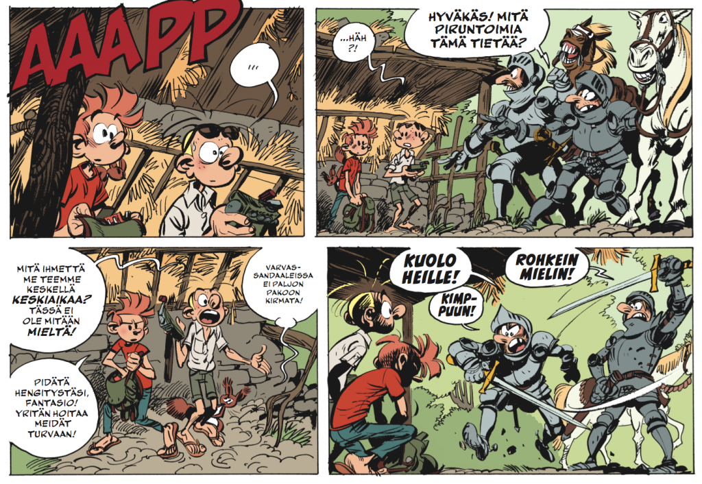 Albumin kolmas rymistely päästää tekijäkaksikon irti eksoottisten toimintaympäristöjen suhteen, eli siinä missä edellinen tarina leikitteli hahmoilla, niin nyt on maisemien vuoro saada kyytiä. Ajan-takaa ajo heittelee sankarikaksikkoamme ympäri historiaa, eli luvassa on muun muassa ritareita, sapelihammaskissoja, uusia pyramideja, merirosvoja ja Villiä länttä…