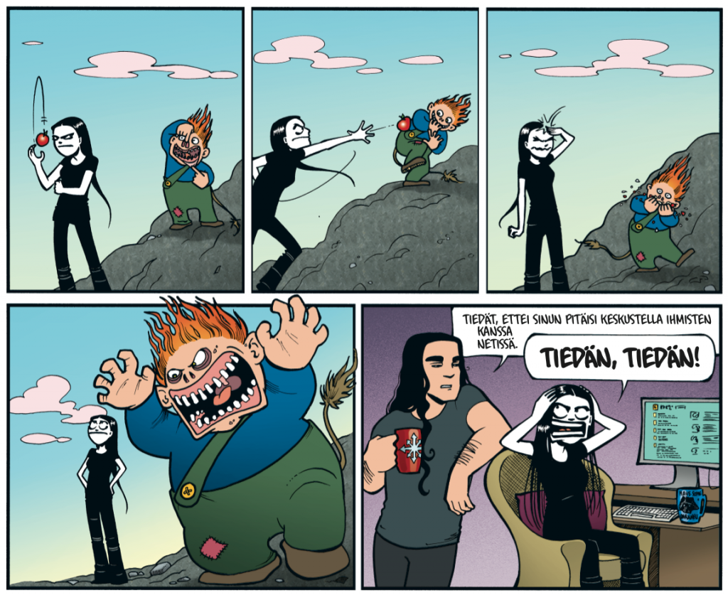 Vuonna 2013 ruokimme trollia, eli tarkastelussa on internetissä tapahtuva sosiaalinen kanssakäyminen. Hyvinkin ajankohtainen strippi juuri nyt.