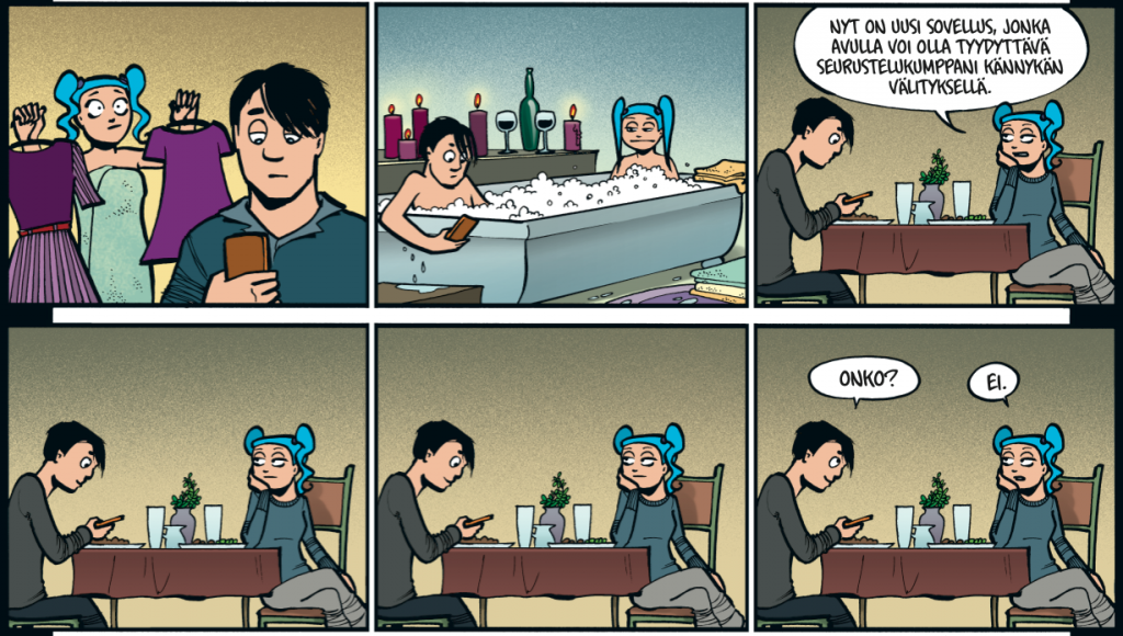 Vuoden 2012 stripissä tarjotaan viisas parisuhdevinkki: mobiililaite ja sosiaalinen kanssakäyminen eivät välttämättä kulje käsi kädessä.