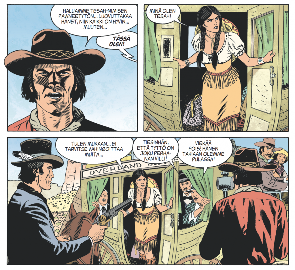 Tarina etenee kahdella aikatasolla, joten luvassa on sekä nuorta että ”nykyhetken” Texiä. Nykyhetken Tesah pitää huolen naiskauneudesta, joka on aina tervetullutta herkkua Texeissä. Muutenhan tämän seikkailun askelmerkit ovat yhtä suurta kunnianosoitusta vanhan koulukunnan Tex-seikkailuille. Kulta-aarre, intiaaniprinsessa, siouxeja, bandidoja, postivaunut… eli oikea kunnon herkkupala kaikille Texin ja klassisen lännenviihteen faneille! Tämä herkkupala tarjoillaan tilaajille ja Lehtipisteisiin 31. heinäkuuta.