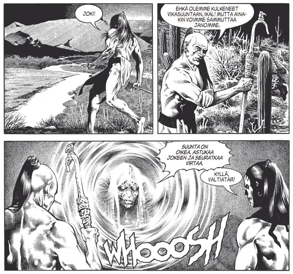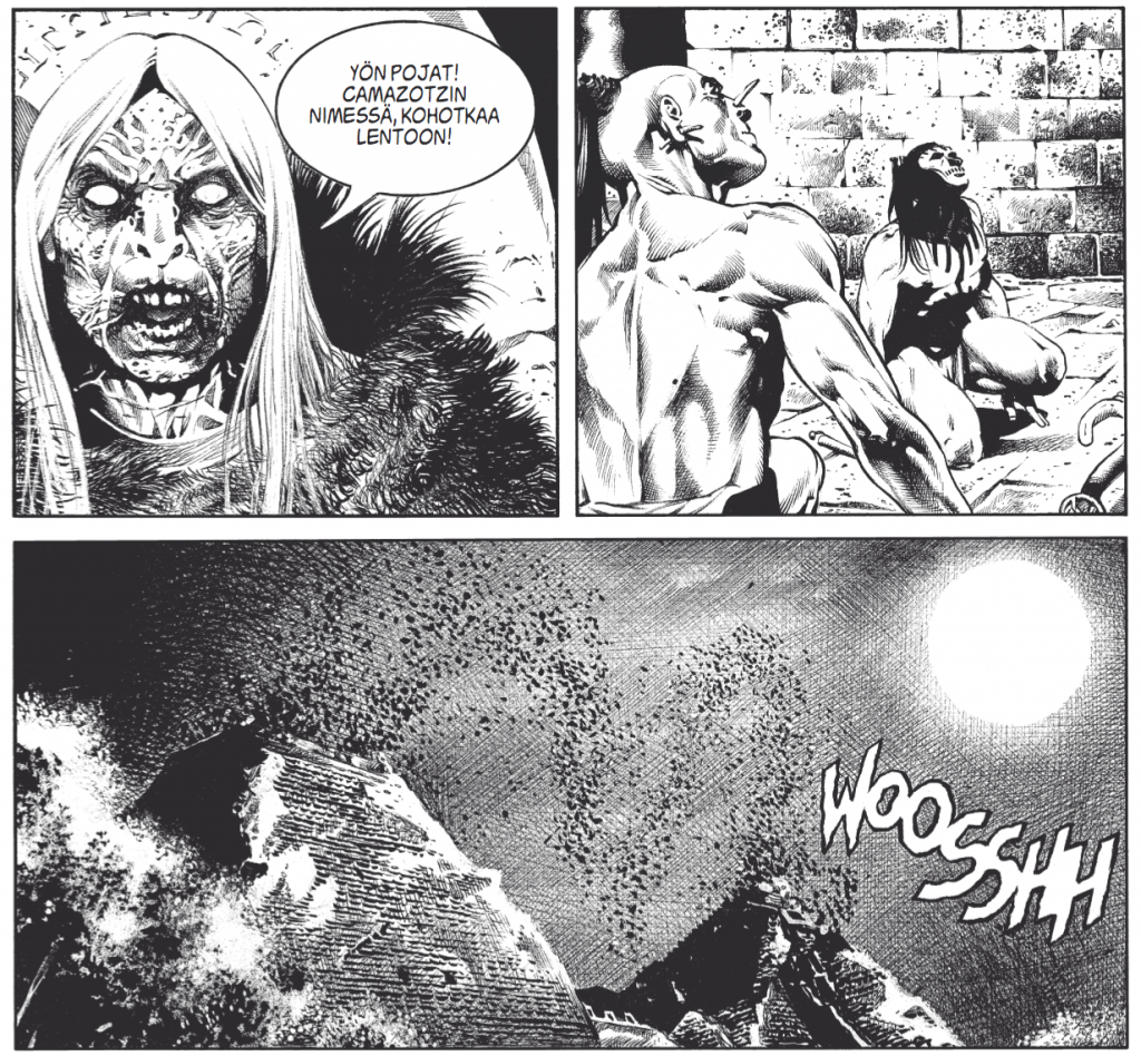 Mukana seikkailussa on luonnollisesti myös Morisco. Tarinasta vastaa Gianfranco Manfredi ja vaikuttavista kauhuvisioista Alessandro Bocci. Allekirjoittanut on melkoisen lääpällään tähän kahden numeron mittaiseen tarinakokonaisuuteen ja eritoten Eztliin, joka tuo tervetullutta vaihtelua kuvankauniisiin intiaaniprinsessoihin. Mefiston ja Yaman ystävätkin tykästyvät varmasti Eztlin osaamiseen leijailevana päänä esiintymisen jalolla saralla!