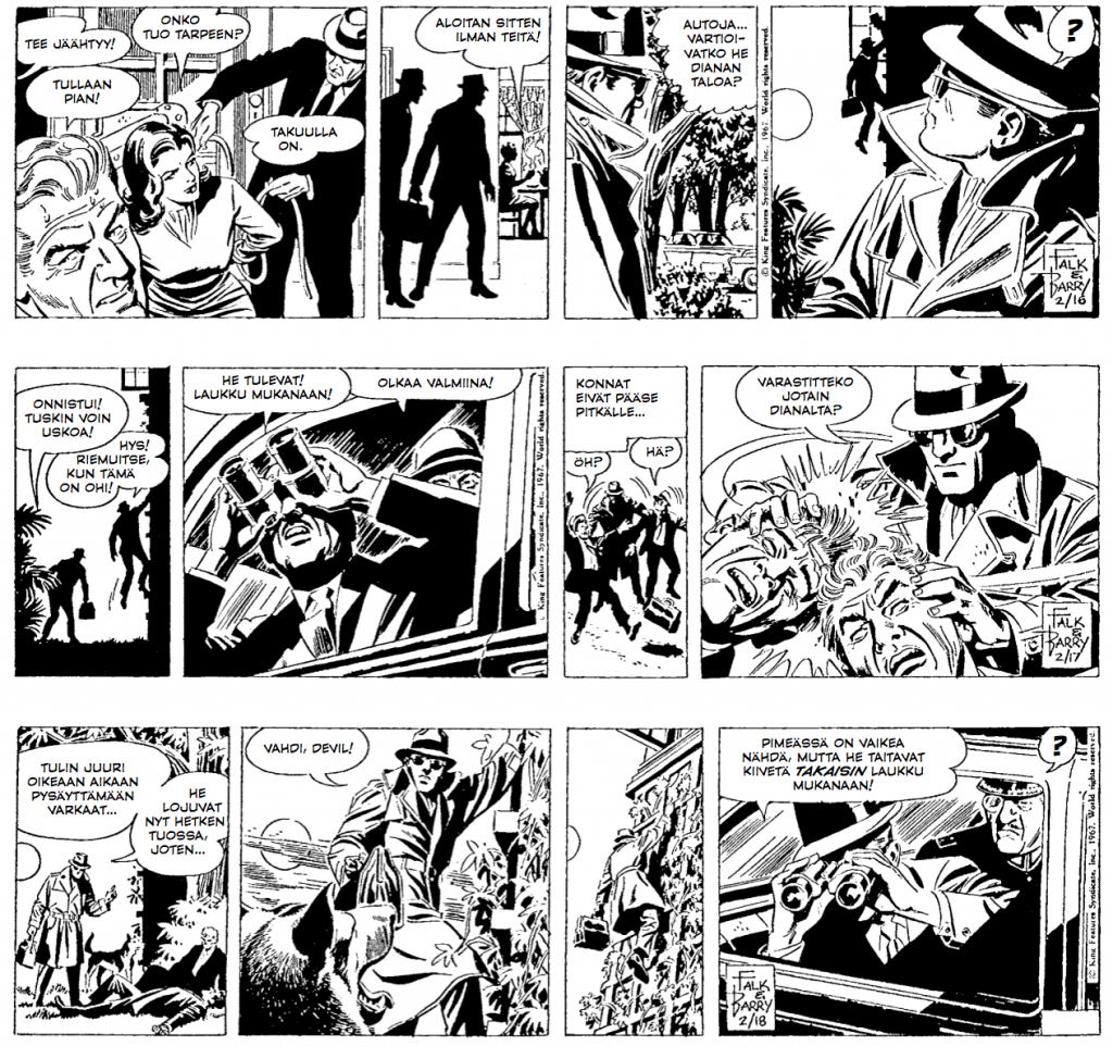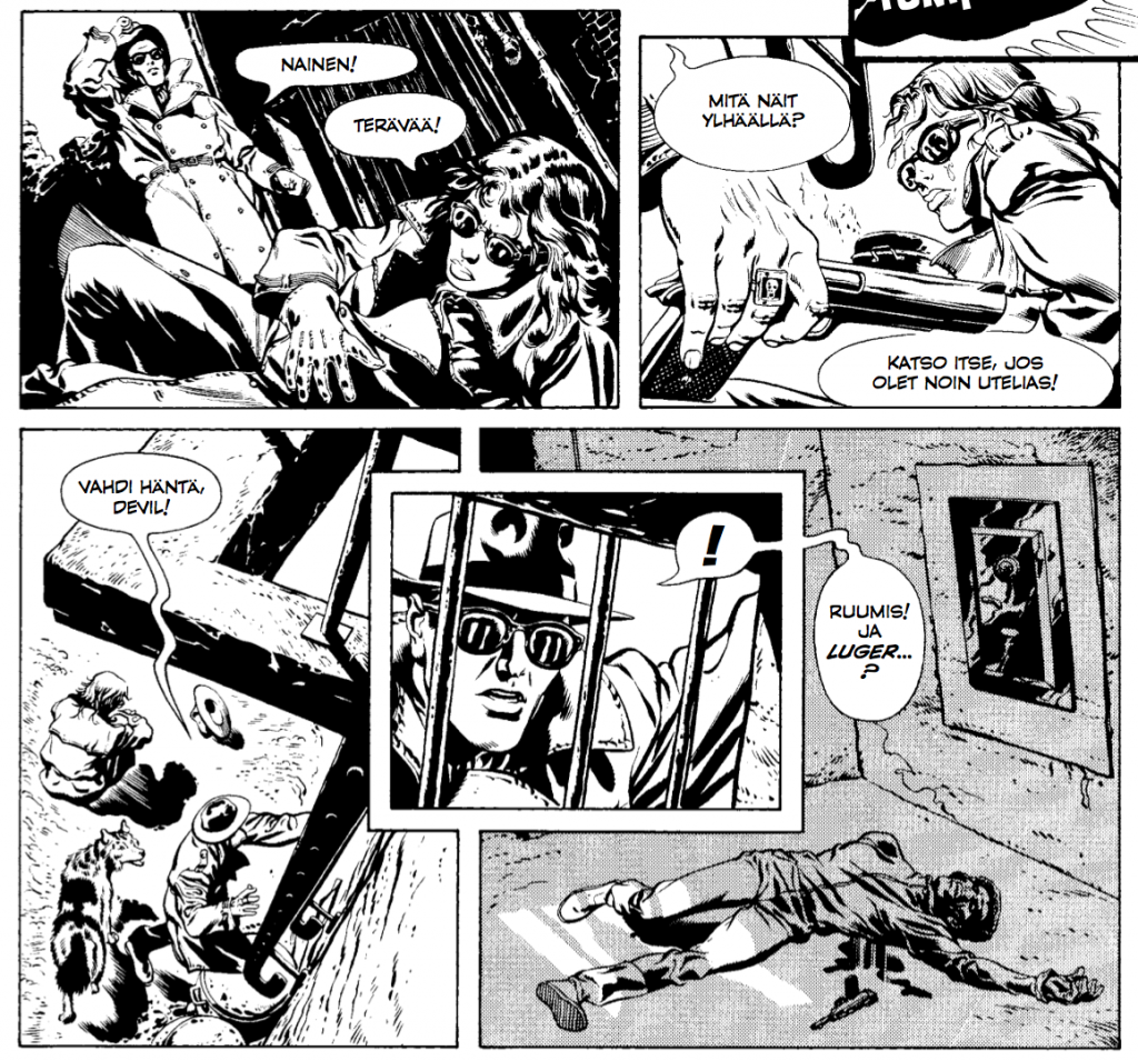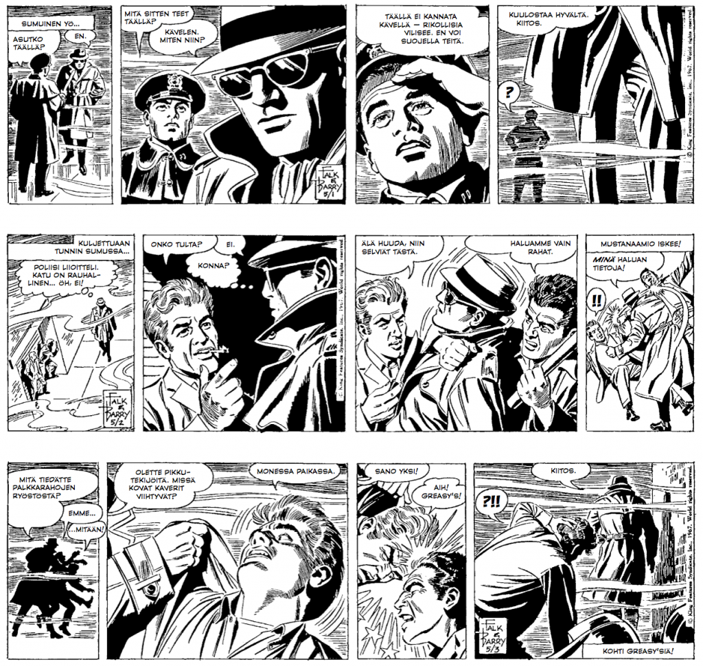 Tässä seitsemän tarinan kattauksessa keskitymme siis trenssitakissa suoritettavaan rikollisjahtiin, lierihattua ja sysimustia aurinkolaseja unohtamatta. Andreas Erikssonin esipuhe Musta kuin yö avaa ja taustoittaa albumin ansiokkaasti ja sitten onkin tyylipuhtaan kasaritoiminnan aika…
