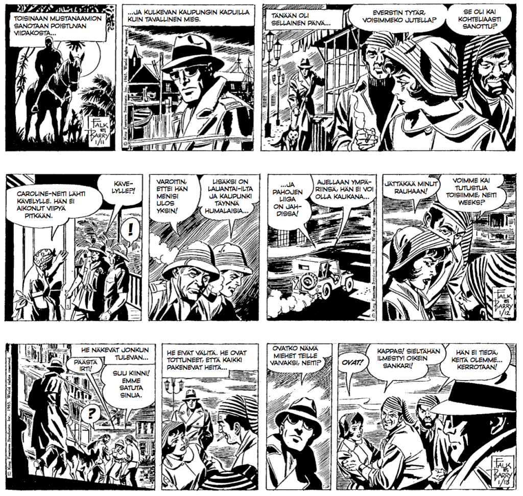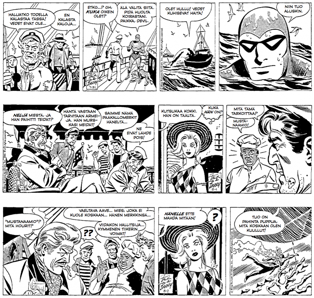 80-luvun lopulta hyppäämme 60-luvun alkuun. Satamarotat tarjoilee merellistä toimintaa Lee Falkin tarinoinnilla ja Sy Barryn kuvituksella. Yritämme tosin albumissa vöittää piitäjän olevan Ray Moore, mutta älkää uskoko meitä. Syvällä viidakossa kauppiaan on pakko nostaa hintojaan, koska satamakonnat ovat ottaneet haltuunsa tukkuportaan yläpään. Mustanaamio matkaa siis viidakosta kaupunkiin hintoja kohtuullistamaan, ja saakin sitten vastaansa melkoisen haiparven, josta suuri osa saa pääkallomerkin leukaperiinsä.