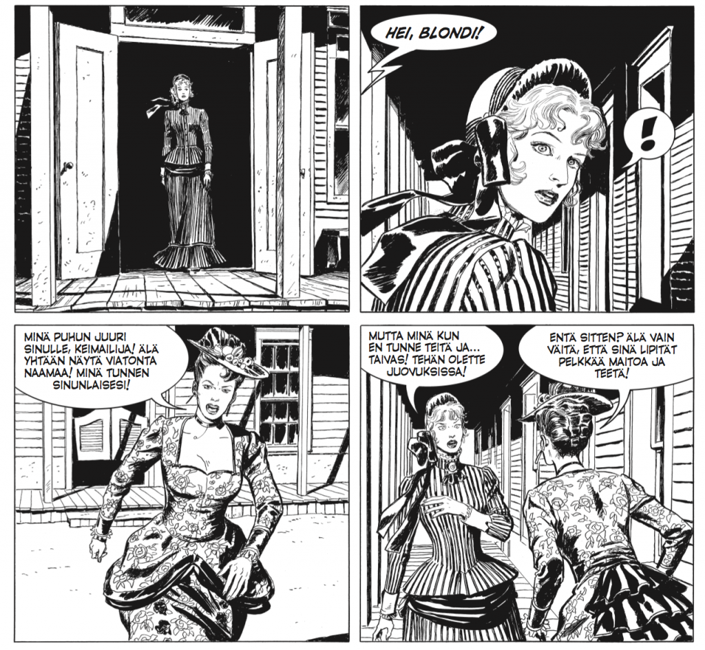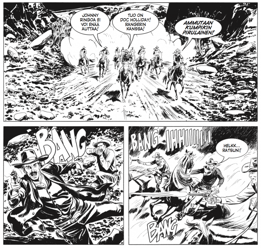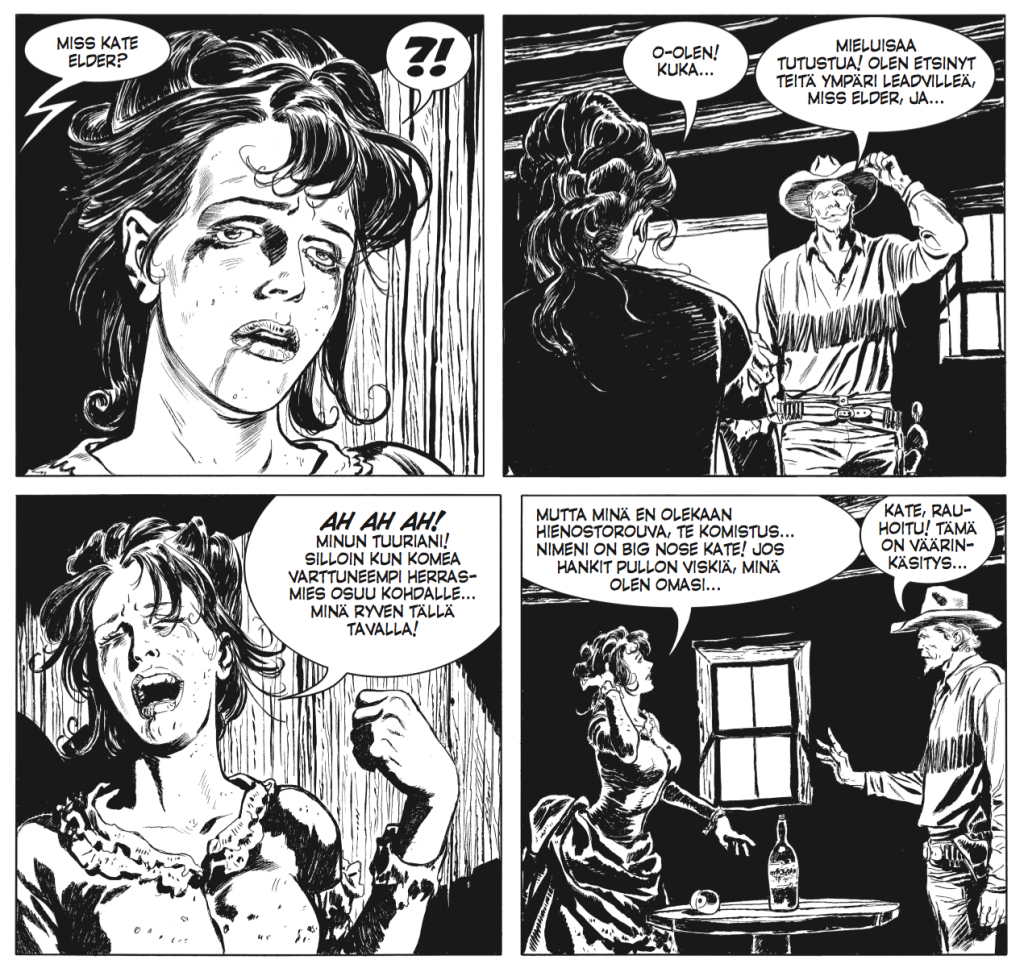 Katen ensikohtaaminen Kit Carsonin ja Tex Willerin kanssa sujuu vähemmän humoristisissa merkeissä. Boselli on mestari annostelemaan raakaa realismia ja huumoria, joten alkuhämminkien jälkeen Big Nose Katesta ja Kit Carsonista saadaan upea nahinakaksikko, jonka keskinäistä nokittelua ja kuittailua on ilo seurata. Ja kun Doc ja Kate tuodaan lukijan iholle haavoittuvaisina ihmisraunioina, eikä pelkkinä kiiltokuvina, niin panokset kovenevat albumin loppua kohti – näille tyypeille alkaa toivoa parempaa tulevaisuutta ja onnellista kohtaloa.