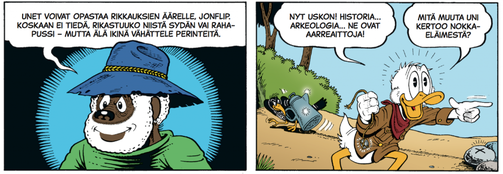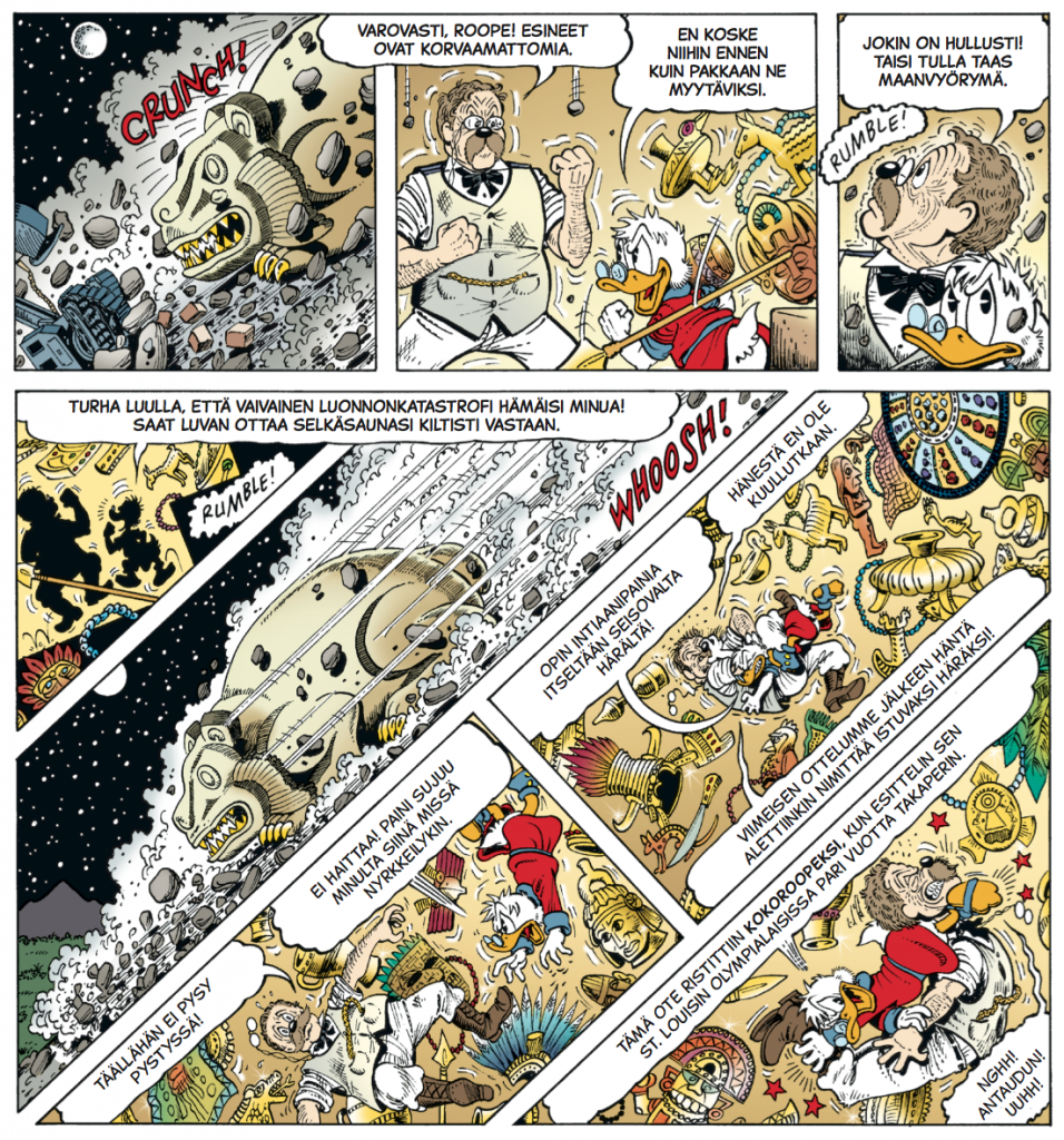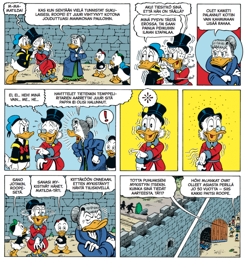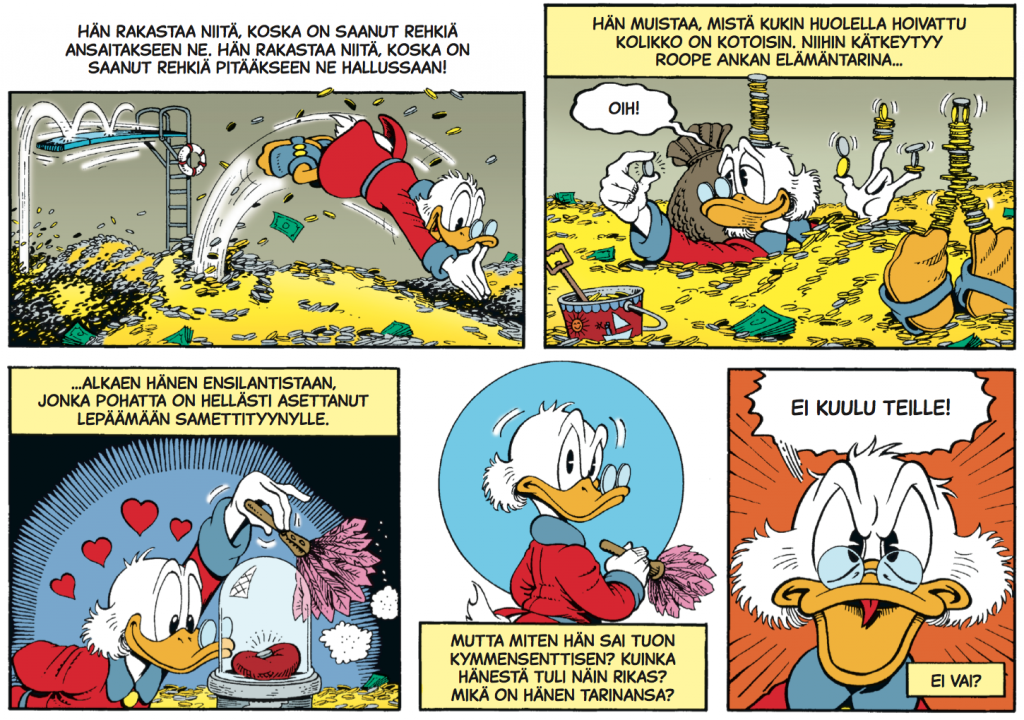 Tanskan Egmontin toimeksiannosta lähtenyt urakka oli juurikin Don Rosalle äärimmäisen passeli mittatilaustyö sekä käsikirjoittajana että kuvitajana. Intohimoinen Disney-sarjakuvittaja toteutti Roope Ankan elämäkerra sellaisella pieteetillä, että luvassa oli mainetta, mammonaa ja Eisner-palkintoja.Sarjakuvataiteilijana Rosa on esikuvansa Barksin tapaan hyvin pitkälle mallia itseoppinut. Rakennusinsinöörikiksi opiskellut Rosa vaihtoi mahdollisuuden kolkuttaessa raksahommat sarjakuvaduunarin töihin. Synnynnäisen tarinankertojan on joskus tehtävä valinta varman leivän ja taiteilemalla saatavien ailahtelevien tulojen väliltä. Ankkafanien oneksi Rosa valitsi viihdyttäjän uran. Ja onpa herra sittemmin taistellutkin taiteilijoille kuuluvien korvauksien puolesta oikein urakalla. Sarjakuvaduunarit kautta maailman kiittävät ja kumartavat. Don Rosa tietää siis oman arvonsa, ja ovella kiitos Eisner-palkinnosta löytyy tarinasta Ankkapalatsin erakko.Rosan koulutuspohja näkyy hauskasti hänen sarjakuvissaan. Rakennuksiin ja arkkitehtuuriin on uhrattu aikaa ja vaivaa. Ja varsinkin kun rakennukset ja rakennelmat lähtevät sortumaan, niin sitten aikaa ja vaivaa on uhrattu todella paljon. Harva kuvaa täystuhoa ja eskaloituvaa romutusta kuin herra Rosa. Näissa tarinoissa ei liikennevälineitä tai monumentteja säälitä. Jopa itse sarjakuvakin ottaa välillä osumaa pahimmissa rytinöissä…Roopen seikkailut heittelevät sankari- ja konnakatrasta ympäri maailmaa, mutta varsinkin Villi länsi tulee lukijalle tutuksi. Länkkäreistä tuttuja historialliasia hahmoja suorastaan vilisee: Buffalo Bill, Annie Oakley, Geronimo, Wyatt Earp, Theodore Roosevelt, Roy Bean… Don Rosa ei todellakaan piilota rakkauttaan historiaa ja maailman kansojen taruaarteisiin. Jos Rosan tarinoista lähtee viisautta ja opetuksia hakemaan, niin historian, tarinoiden ja tarinankertojien arvostaminen kuuluu niistä tärkeimpiin.Tarjolla on siis reilut 450 sivua parasta mahdollista seikkailusarjakuvaa. Tai ei ehkä parasta mahdollista, sillä tunnetustihan Don Rosa ei osaa olla töihinsä tyytyväinen. Ainakin allekirjoittanut lukeekin yhdeksi Rosan valtavan suosion syistä tietyn jokamiseluokassa operoimisen, eli ajoittaiset amatöörimäiset ratkaisut ja kömpelyydet pitävät korkealentoisimmatkin seikkailukoohotukset maanläheisinä ja helppolukuisina. Don Rosa ei uudista tai kehitä sarjakuvakerrontaa, vaan käyttää sitä tarinan ehdoilla ja lukijan viihdyttäminen edellä. Lopputulemana on lukijaa jopa liikuttavaa sarjakuvaa, sillä kaiken tohinan ja romahtavien rakennusten keskellä Rosan tulkinta näistä hahmoista on tehnyt niistä lukijoille aikaisempaakin läheisempiä. Ja tällä kertaa sokerina pohjalla väijyy tämän tuhdin eeopksen päättävä Kirje kotoa, jonka lopussa saattaa olla syytä olla nessupaketti valmiina.Nämä 12 plus 9 seikkailua on pakattu lukijaa hellivällä tavalla, sillä tämän kovakantisen opuksen voi melkoisen huoletta asettaa aukinaisena pöydälle ilman kirjan selkämyksen vaurioitumisen vaaraa. Toisin sanoen käyttäjäliittymä on erittäin lukijaystävällinen. Ja ainakin allkirjoittaneen silmää hillityn mattapintainen kansi koristepainatuksineen miellyttää kovasti, joten kyllä tätä teosta uskaltaa lahjapakettiin suositella muutenkin kuin jouluna. Teos sisältää myös siinä määrin elämänviisautta, että se sopii valmistujaislahjaksikin ikähaarukalla seitsemästä sataan.