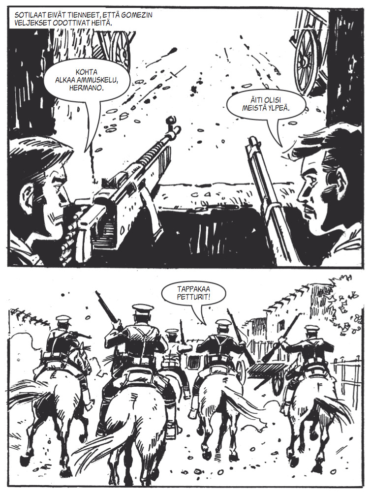 Tämä tarina tarjoilee perus-Korkkareihin verrattuna enemmän hevosia ja westerneistä tuttuja maisemia, joten suositus Tex Willerin ystäville. Dynaamiitillakin on oma roolinsa tarinassa. Sarjatultakaan ei säästellä, kun sankariveljekset linnoittautuvat puolustaakseen pientä kylää Huertan joukkoilta. Luvassa on juonittelua ja epätoivoisia ratkaisuja molemmin puolin rintamaa. Tarinasta vastaa Richard Davis ja taiteesta Carlos Pino.