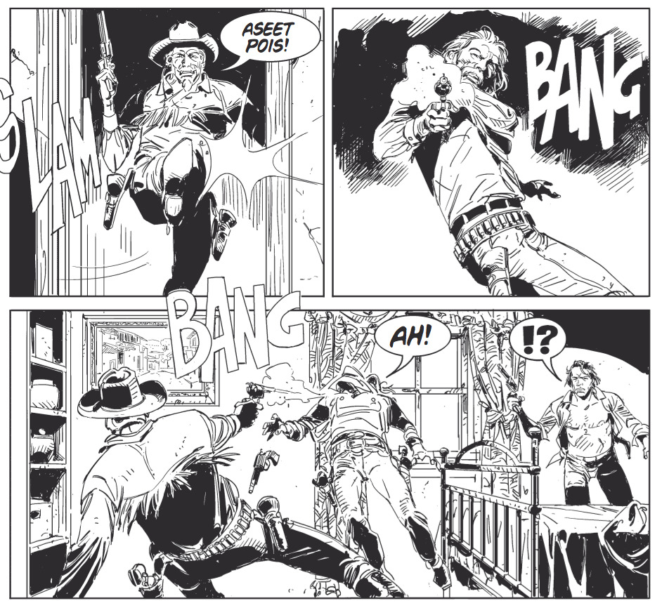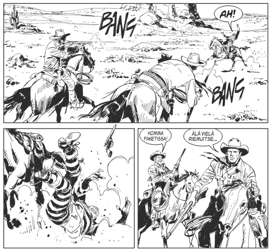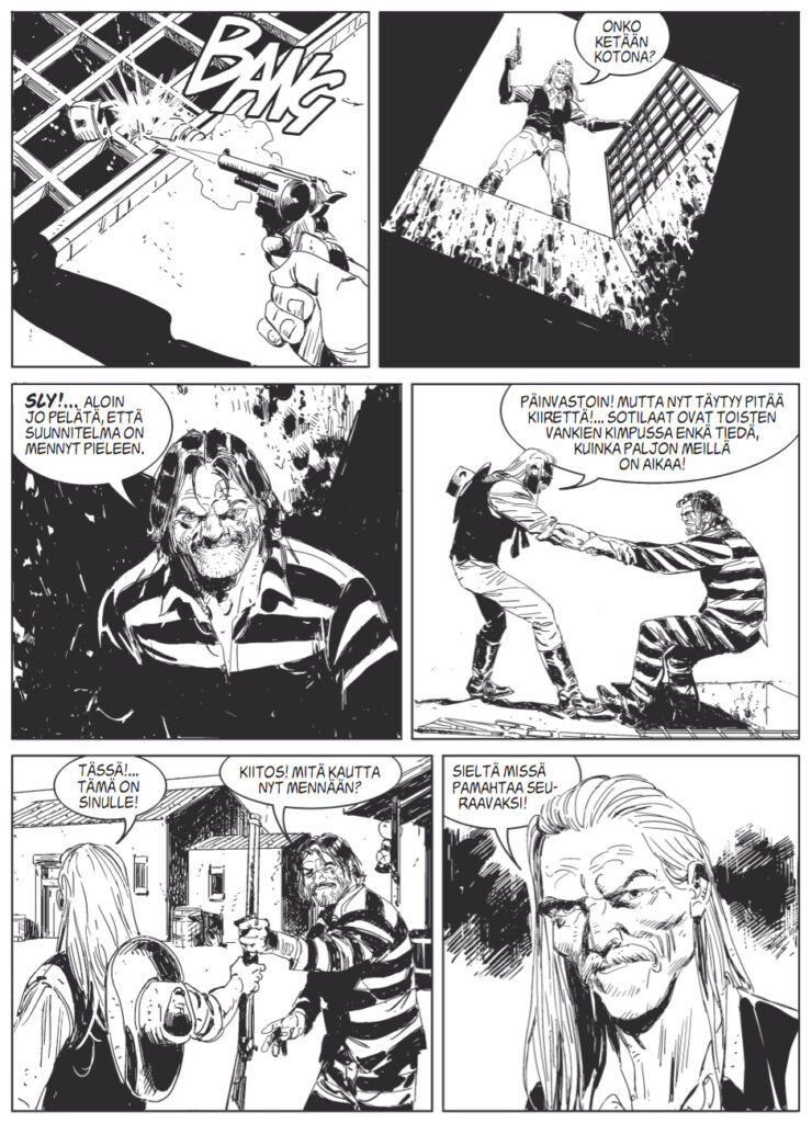Ja räjähtävää toimintaa todellakin on luvassa, kun seuraamme konnalauman pakoa vankilasta. Dynamittia ei nimittäin siinä operaatiossa säästellä. Tässä Texissä on konnarintamalla ihastuttavan kunnianhimoinen ote. Rauch marssittaa eteemme kahden pääkonnan lisäksi useita tärkeitä kätyreitä. Onneksi konnalauma pysyy tiukasti Rauchin hyppysissä, joten henkilökaarti on esimerkillisesti tasapainotettu. Lukija pysyy siis kärryillä, eikä touhu mene Tulen ja jään lauluksi.