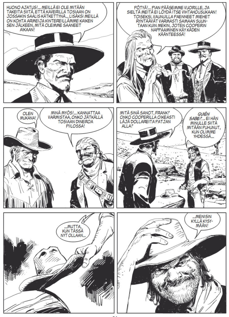 Myös Prisco loistaa konnakatraan parissa. Sankari on usein vain yhtä hyvä kuin konnansa, joten Tex ja Kit Carson pääsevät nyt kunnolla töihin. Priscon ja Rauchin tiimi on hoksannut, että konnan pitää olla joko karismaattisempi tai vähintään yhtä karismaattinen kuin vastaparinsa, tai sitten päinvastaisella tavalla ilmeikäs ja persoonallinen. Ja tällä kertaa ilmeikkäistä konnista ei tule puutetta. Sergio Leone olisi ylpeä.