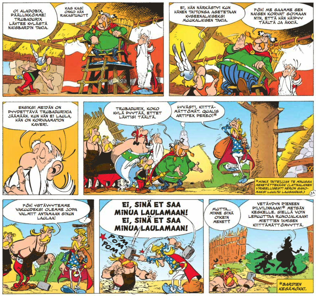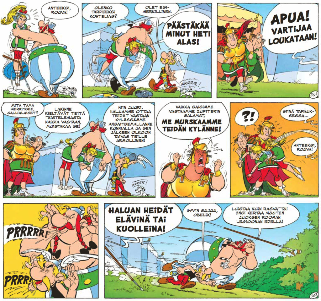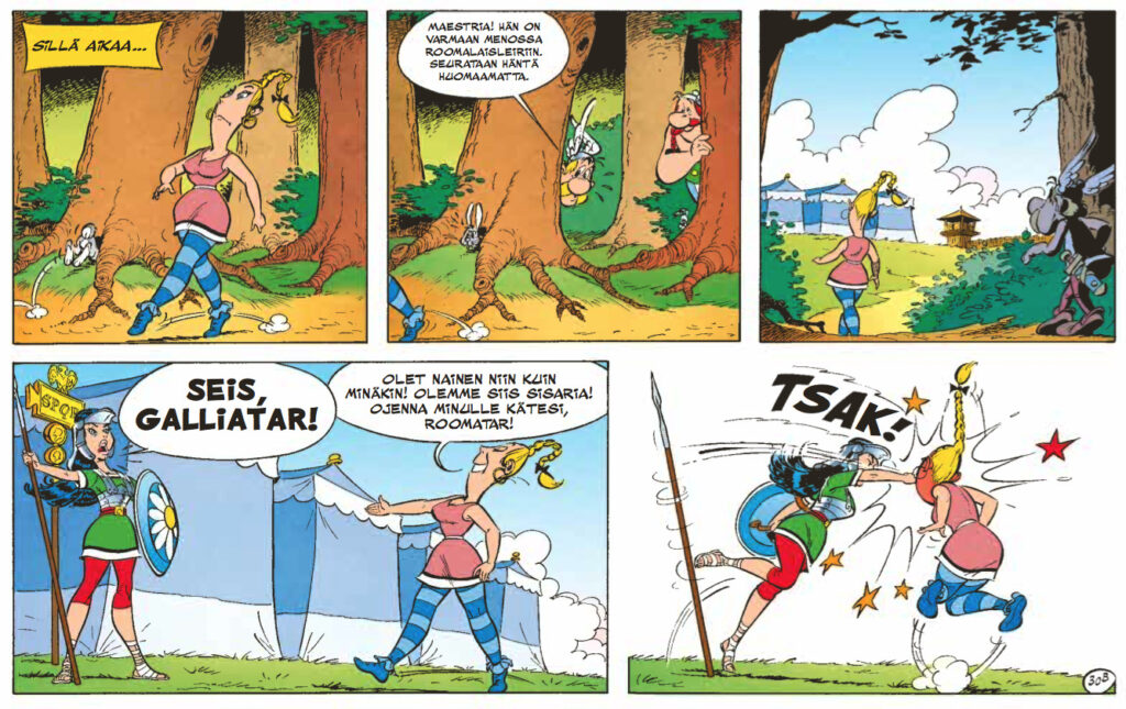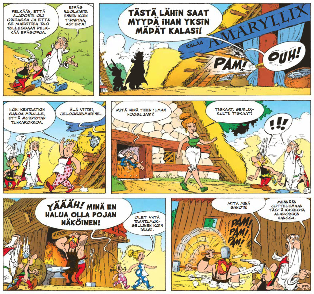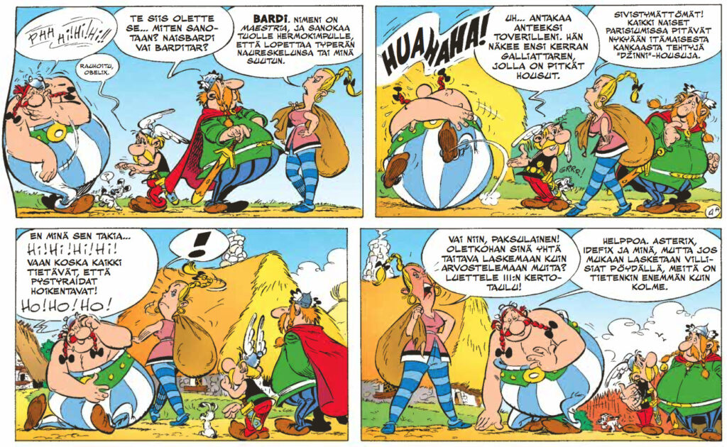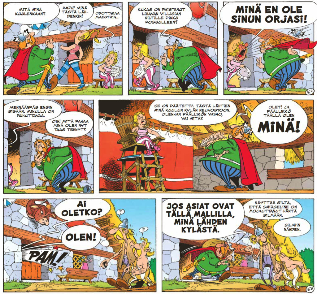 Ensiksi on syytä myöntää tosiasiat – René Goscinnyn käsikirjoittama huumori on kestänyt aikaa yllättävänkin hyvin, mutta Albert Uderzon kirjoittamissa Asterixeissa ei ole samaa teflonpinnoitetta. Goscinny osasi tanssittaa hahmojaan vanhojen arvojen ja uusien tuulien ristiaallokossa mestarillisesti. Uderzo oli partneriaan paljon konservatiivisempi humoristi, eli ideoiden ja asenteiden ympärillä tanssahtelu vaihtui osoittelevampaan huumoriin. Ja keskenkasvuisempaan. Keskenkasvuisuuden ymmärtäminen onkin tärkeää tämän albumin nauttimisen kannalta. Tässä kuitenkin on kysymys siitä, että Asterixin ja Obelixin kuuluu saada pysyä ikuisesti poikina. Ja ikuisista pojista kaikista kauheinta ovat tietysti tytöt, joten tällä kertaa Uderzon sormi osoittelee feminismin kauhuja