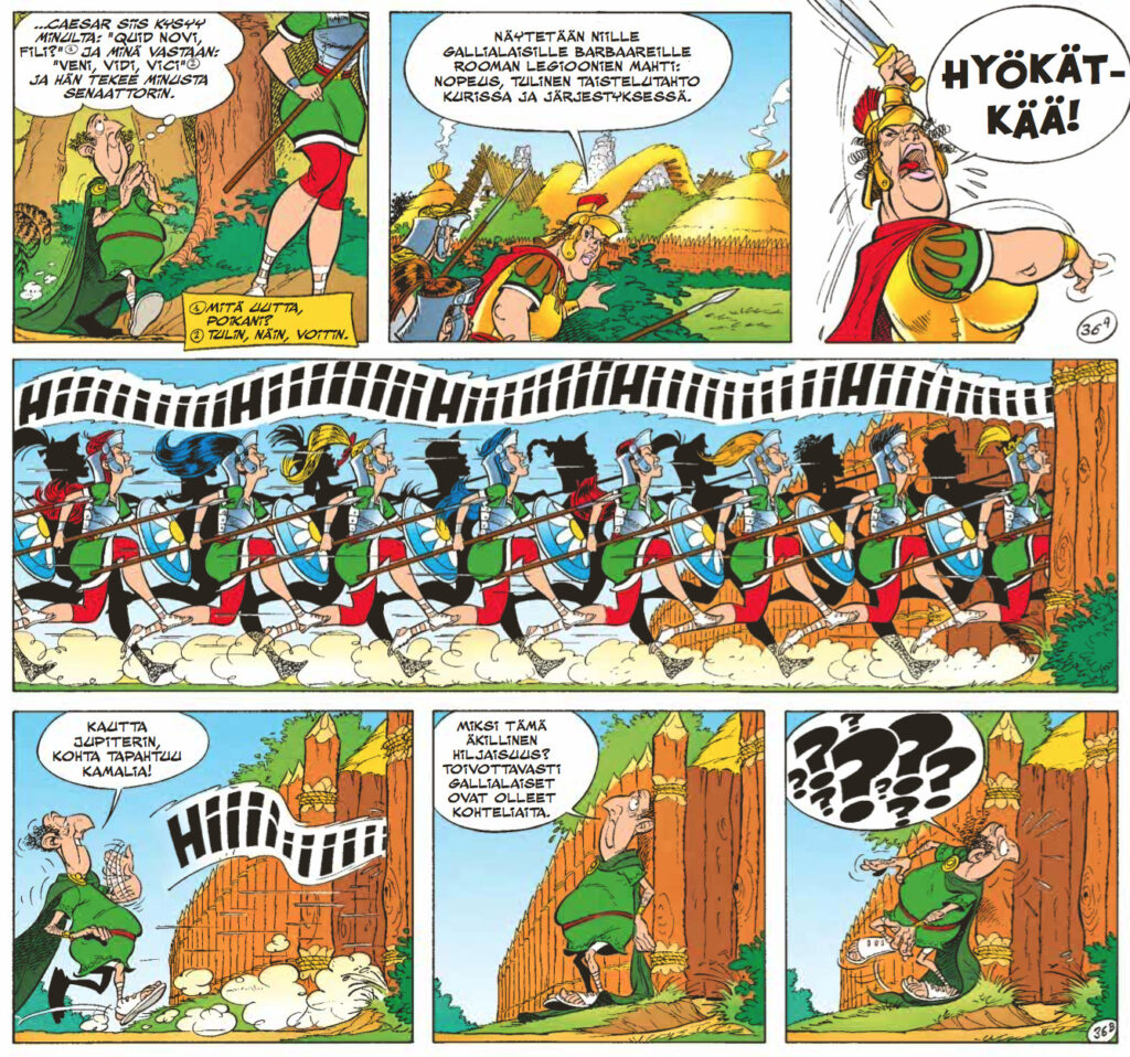 Lyömistä tässä albumissa tapahtuu hämmentävänkin paljon. Vitsigeneraattorista kun puuttuu se tärkeä toinen puolikas, niin hahmot turvautuvat väkivaltaan todella pienestä yllykkeestä. Tämä pätee sekä galleihin että roomalaisiin. Suosittelemmekin siis albumia eritoten Terence Hillin ja Bud Spencerin elokuvien ystäville.