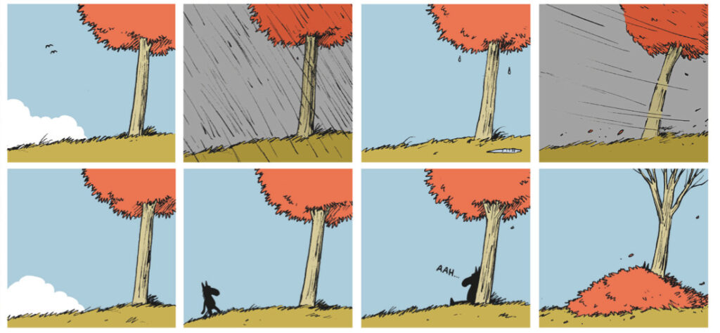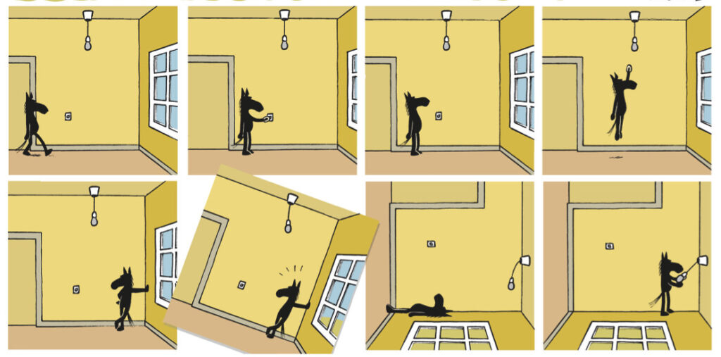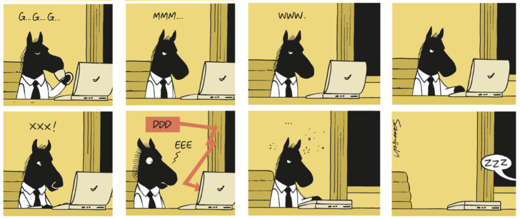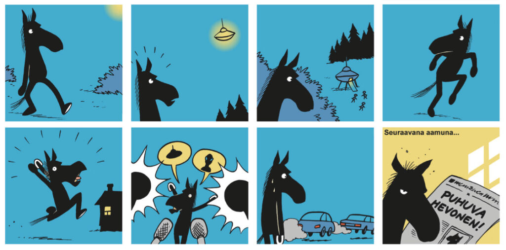 Syksy jolkuttelee pikkuhiljaa huudeille. Juuri nyt on sarjakuvahehkutteluun sopivan aurinkoista ja jopa helteistä, mutta jo huomiseksi on luvassa sadeapilviä. Sadepilviä on luvassa Heikki H. Hevosellekin, sillä pollemme kohtaa painotuoreimman albuminsa sivuilla taas koko joukon koomisia vastoinkäymisiä, joiden katraassa sade- ja ukkospilvet ovat säännöllisiä vieraita. Tämän syksyn Musta hevonen -albumi kantaakin nappiin osuvaa nimeä Sattuvaa huumoria. Kurkistetaanpa siis sen kansien väliin!