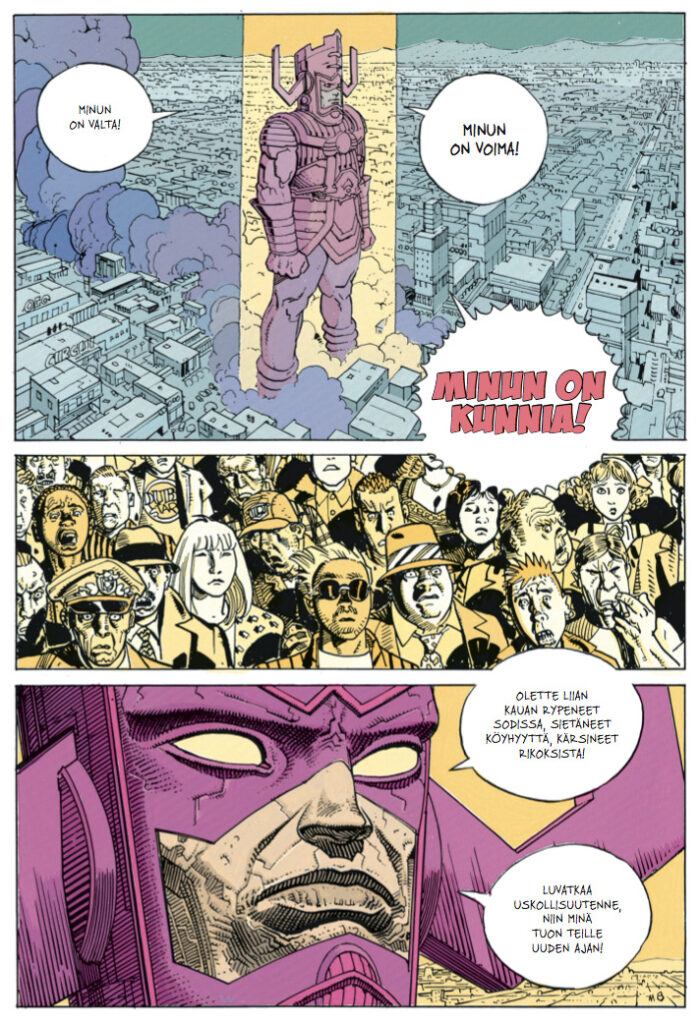 Vertauskuvien tekijät ovat raskainta mahdollista sarjaa, eli vanhan mantereen scifi-mastro Moebius kohtaa uuden mantereen supersankarimaesto Stan Leen. Allekirjoittanut muistaa aikoinaan hieman pettyneensä lopputulokseen, mutta tämä tarinahan on ikääntynyt kuin hyvä viini. Hyvin erilaisista lähtökohdista ponnistavat tekijämiehet saivat aikaiseksi aikuisten sadun, jossa jumalankaltaisten olentojen konflikti vie ihmiskunnan äärirajoille. Luvassa on massahysteriaa ja rumia päitään nostavia populisteja. Vertauskuvia onnistuu siis olemaan kenties yllättävänkin ajankohtainen. Tarina ansaitsee siis uusintansa ja on juuri oikeassa paikassa tämän kokoelman avauksena. Ennen Vertauskuvien lukemista tai heti sen jälkeen suosittelen avaamaan tämän opuksen sivulta 334 ja lukaisemaan Moebiuksen kommentit tarinan työstämisestä.