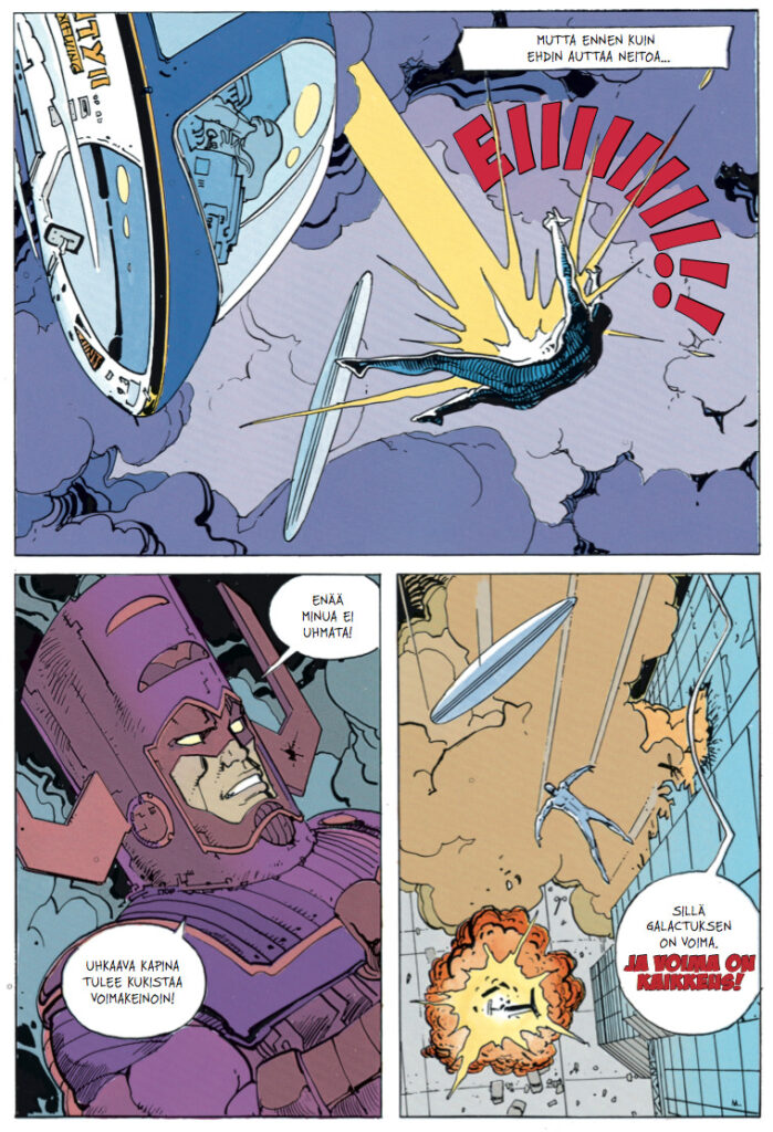 Naiskauneudelle ei ole immuuni Hopeasurffarikaan, sillä tämän tarinan kaunottaret vievät sankariamme kuin litran mittaa. Supersankarointia, avaruusseikkailua ja romantiikkaa siis tarjolla. Aivan mainio eeppisiä mittoja hipova todellisuuspakoilu siis kyseessä. Keith Pollard kanavoi sisäistä Jack Kirbyään ja aivot voikin surutta viedä narikkaan tämän tarinan ajaksi. Guardians of the Galaxy ei ponnistanut tyhjästä – Orjuuttajat tarjoaa juuri sitä samaa: viileitä hyviksiä, ihanan pahoja pahiksia, räjähdyksiä, otuksia, paljasta pintaa, sädeaseita, Kostajia… 80-lukua ysärimaustein, eli tämän päivän leffa-Marvelia. Lystiä joka tapauksessa.