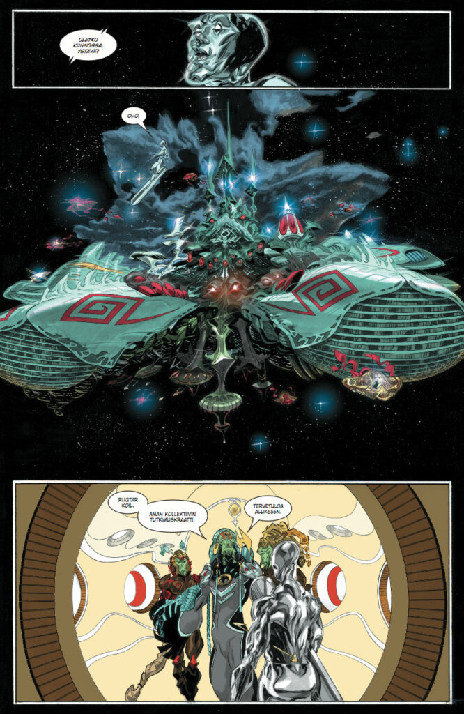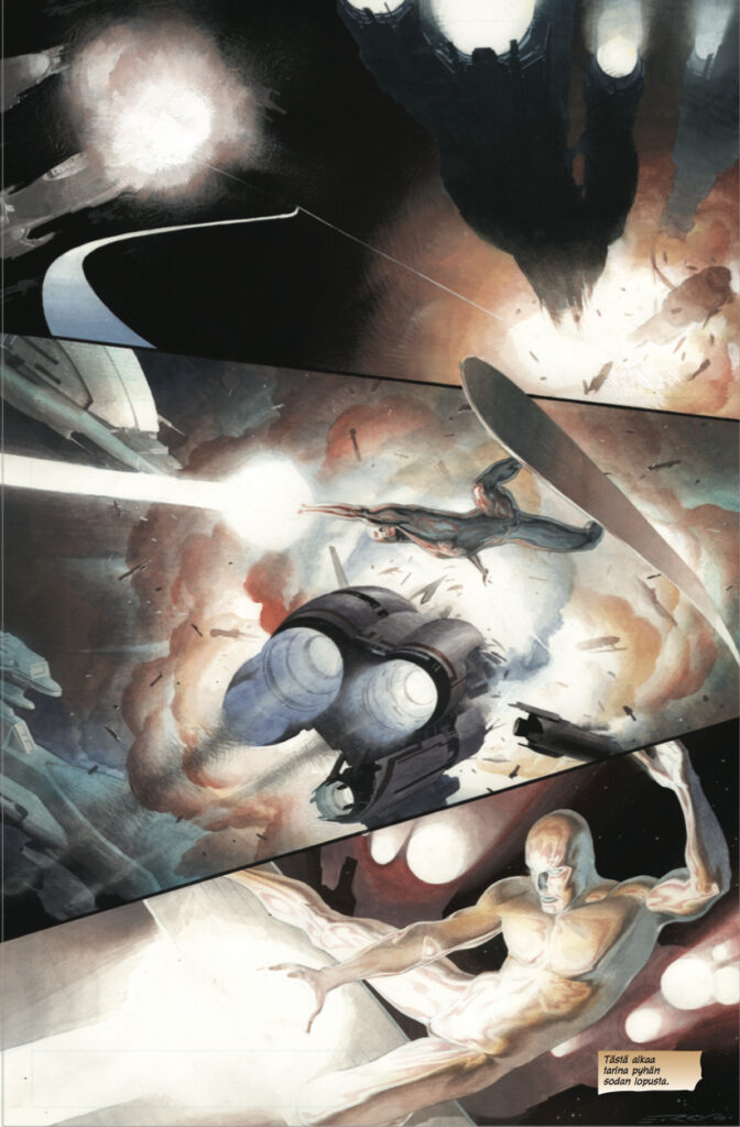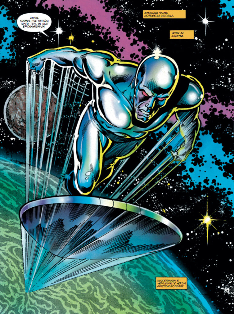 Kesän loppuminen etenee harppauksin ja tätä kirjoittaessa ulkona vallitsee pimeys. Sadepisaroiden rummutus maustaa avoimesta ikkunasta kuuluvaa äänimaisemaa. Onneksi sarjakuvat tarjoavat oivan pakokeinon Suomen syksyn ankeudesta, joten napataanpa syksyn sadostamme tällä kertaa hehkuteltavaksi se ehdottomasti eksoottisimmat visiot tarjoileva teos, eli suuntaamme avaruuden ääriin Hopeasurffarin seurassa. Silver Surfer: Sielunmessu paketoi yksiin kansiin neljä kosmista seikkailua, joissa ei suuria tunteita tai teemoja säästellä. Näissä tarinoissa on isosti ihmeen tuntua, mutta kun oikein silmiin katsotaan, niin todellisuuspakoilun lisäksi tarjolla on ikuisesti ajankohtaisia teemoja teemoja, joista osa viistää tai jopa viiltää ihan tämän päivän uutisia meiltä ja muualta.