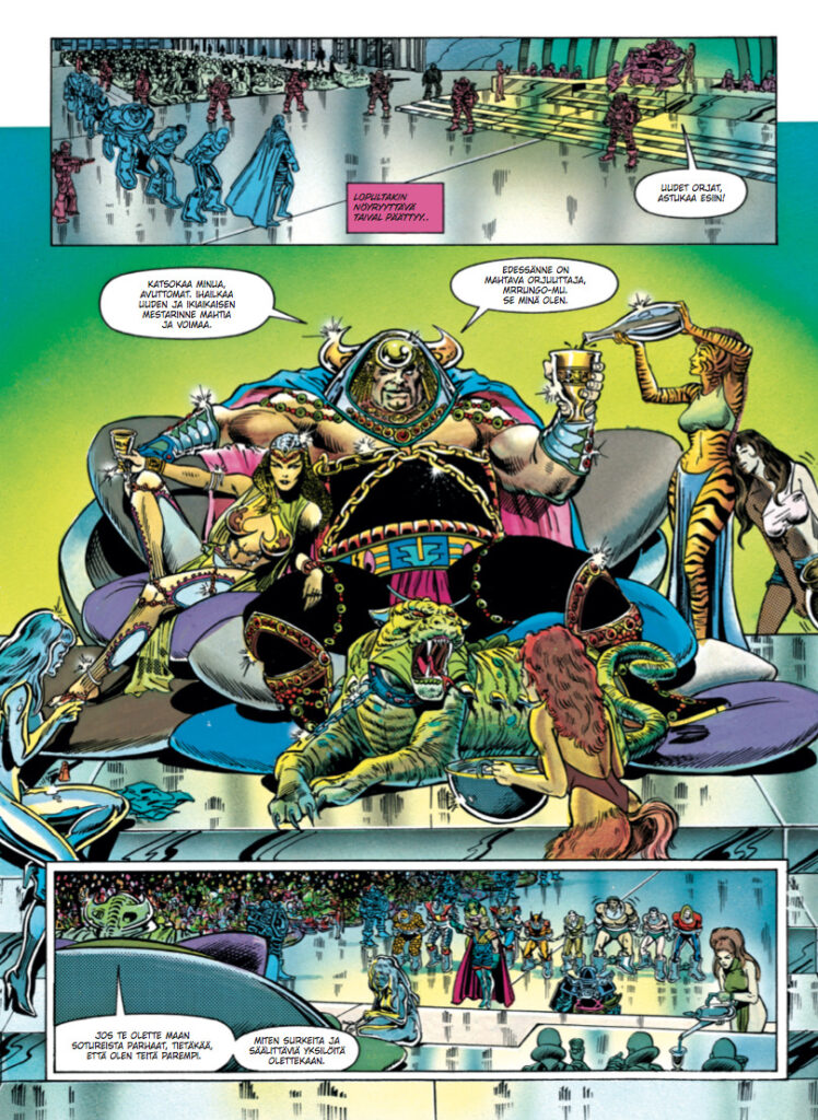 Stan Lee on ollut mukana ideoimassa tämän kokoelman seuraavakin tarinaa. Keth Pollard on toinen kirjoittaja, ja vastaa myös taiteesta. Orjuuttajat (The Enslavers) on vuodelta 1990. Tai jos tarkkoja ollaan, niin Lee juoni tarinan 80-luvun alussa ja Pollard sai valmista aikaiseksi melkein kymmenen vuotta myöhemmin. Jos Vertauskuvia toi Marvelin supersankarikuvioihin ranskalaista älykkösäväystä, niin Orjuuttajat on sitten ihan sitä itseään, eli Marvelin meininkiä isolla M:llä ja täysin pidäkkeettä. Jos Star Wars värikkäimmillään maittaa, niin tämä tarina on sinua varten. Tarinan konnana maailmoja alistava Mrrungo-Mu on Hutt Jabba steroideilla. Körmy pieksee siis Wolverinen pikkurillillään, mutta joutuu pulaan naiskauneuden ääressä.