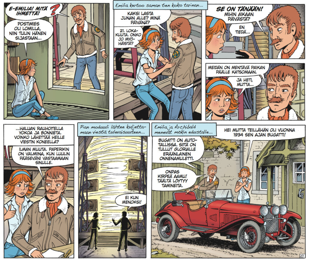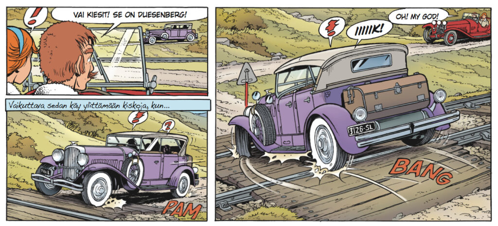 Jos hautausmaat ja enkelipatsaat hirvittävät, niin tämä seikkailu avataan oikein maukkaissa kauhutunnelmissa. Osa albumin sankarittarista kokee syrjäisen skotlantilaisen hautausmaan tunnelmat pienten lasten hautoineen sen verran ahdistavaksi, että asialle tarvitsee tehdä jotakin. Onneksi neitokaisilla on tiedossaan toimiva aikakone, joten pelastusoperaatio menneisyydessä käynnistyy. Aikamatkustamisen paradokseille uhrataan sentään ajatus jos toinenkin, muuten saattaisi herätä epäilys, että Leloup vain etsii tekosyytä päästäkseen mehustelemaan nostalgisilla menopeleillä. Kyseessä kun on kuitenkin operaatio, jonka osapuolet ovat Bugatti…