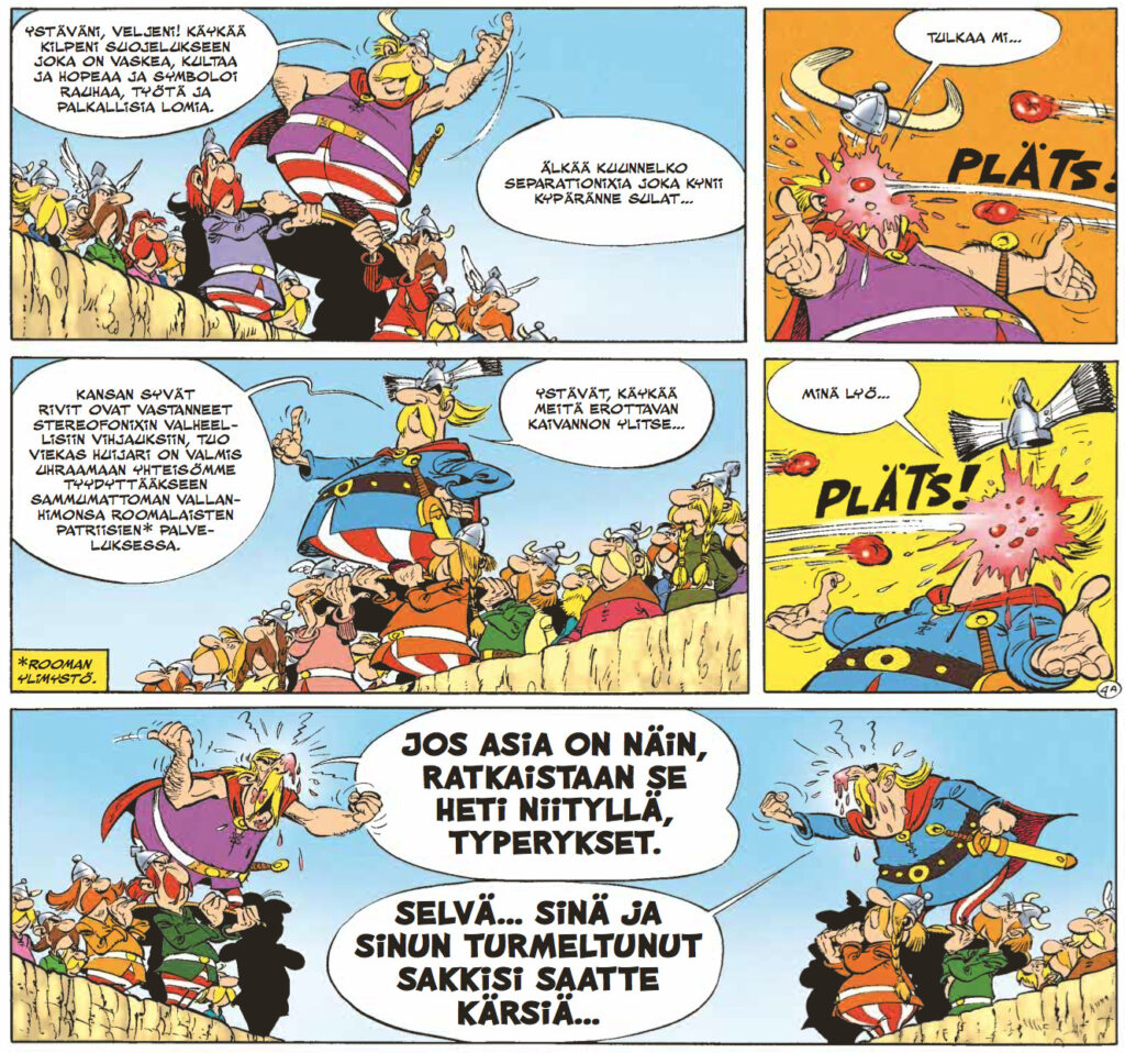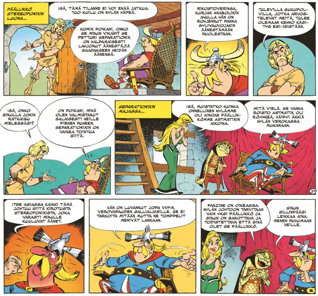 Asterixeissa harvemmin tarjoillaan romantiikkaa, mutta tällä kertaa luvassa on hieman pussailuakin. Stereofonixin ja Separationixin kiistelyn ohella ruututilaa saavat myös näiden jälkikasvu, eli komea Komix ja kaunis Fanzine, jotka pyrkivät ajattelemaan kylänsä parasta ja älyävät tilata ulkopuolista sovitteluapua.