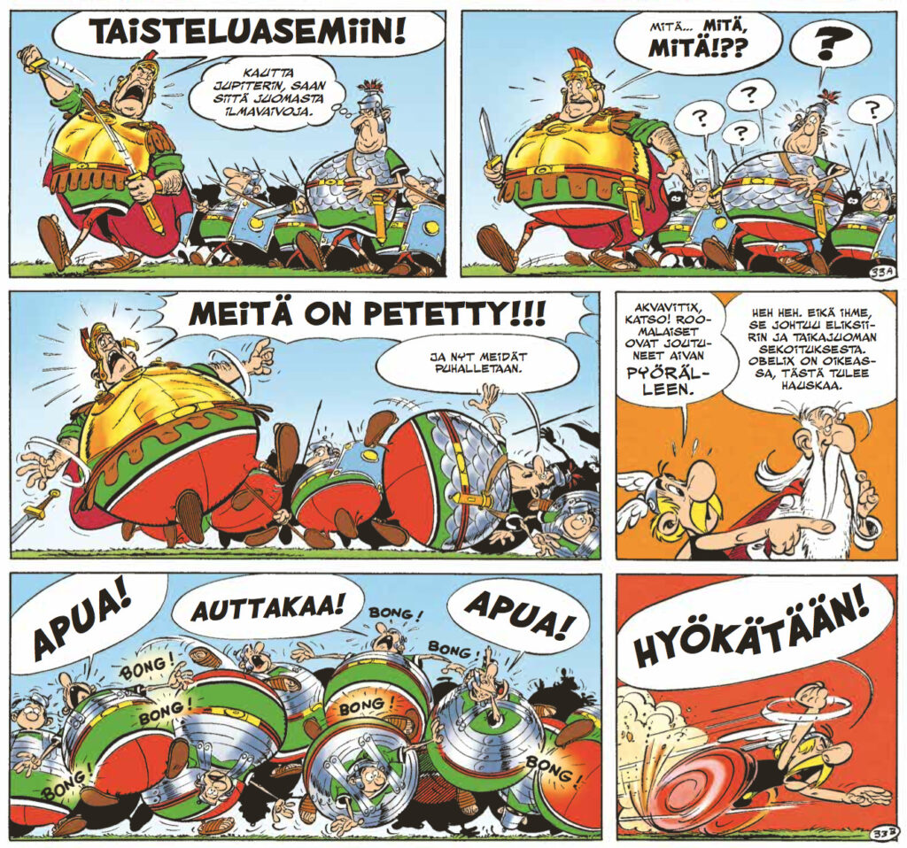 Asterix, Obelix ja Akvavitix pääsevät siis tässäkin albumissa mielipuuhiinsa, eli toimimaan tolkun hahmoina (vaihtelevalla menestyksellä), muksimaan roomalaisia ja keittelemään epäilyttäviä liemiä. Roomalaisten kovasta kohtelusta huomaa, että käsikirjoitusvastuussa on nyt visuaalisemmin ajatteleva taho.