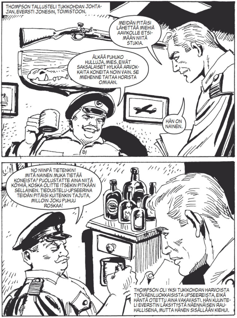 Everstin epäluuloista huolimatta Stuka-jahti alkaa. Oppaaksi värväytyy saksalaislentäjä, mutta kannattaako veijariin luottaa? Ja pystyvätkö britit luottamaan edes toisiinsa? Ja löytyvätkö Stukat lentokuntoisina? Kaikki tämä selviää pokkariin sijoittamalla! Tarinan juoni kasaan Andrew Knighton ja kuvituksen kynäilivät ja tussasivat Muller ja Klacik.