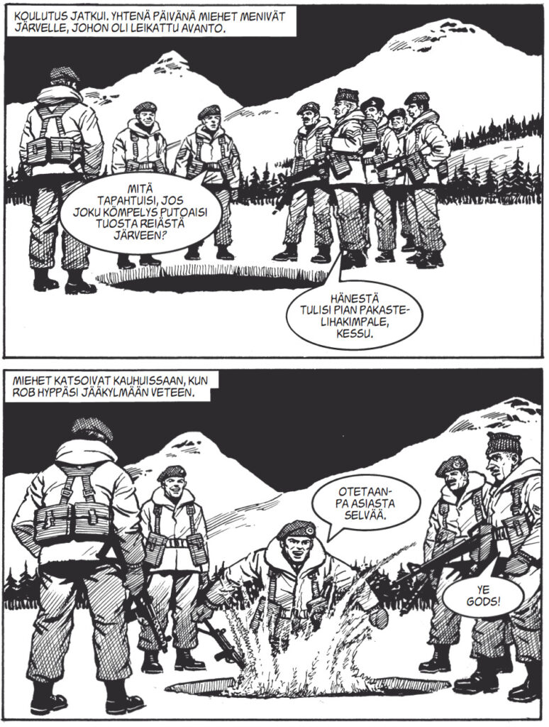 Sokerina pohjalla värjöttelee Talvinen taistelu, joka vilauttaa meille Falklandin sotaakin. Olemme siis 80-luvulla ja tarina käynnistellään talvisissa tunnelmissa, kun merijalkaväen kovanaamat koulivat ilmavoimien erikoisjoukkojen kovanaamoja. Kovanaamojen nokkapokkaa siis luvassa. Ja suomalaista lukijaa huvittavia koulutusmetodeja.