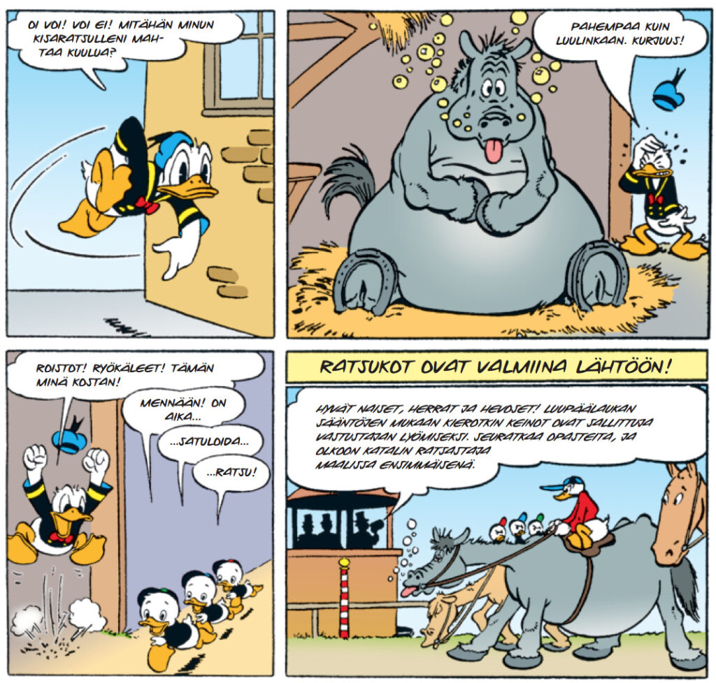 Aloitamme kilparatsastustunnelmissa Huonolla häviäjällä (The Hard Loser) vuodelta 1943. Aku on ankanpoikia persompi pokaaleille, ja sen myötä valmis vippaskonsteihin. Tupulla, Hupulla, Lupulla ja Henttusella onkin täysi työ maaliin pääsyn kanssa, vaan onko Aku yhtään onnekkaampi? Ja miksi tarinan loppu on sensuroitu? Se selviää tämän teoksen lukemalla.