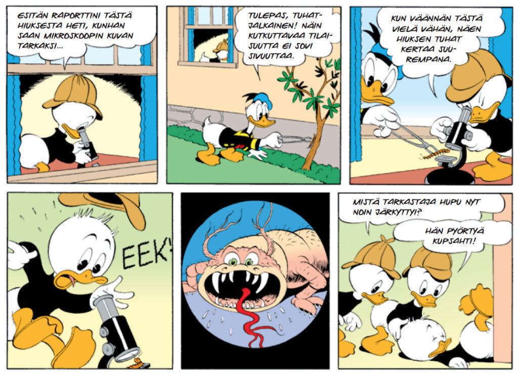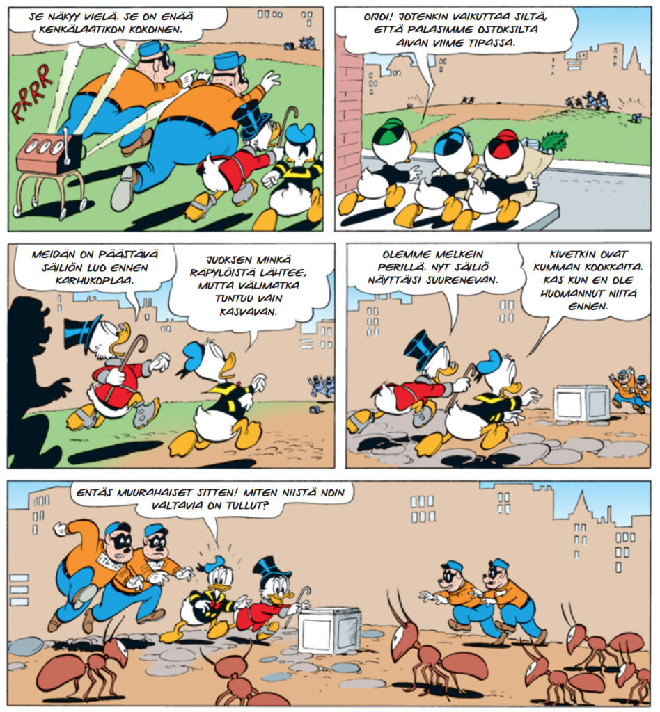 Atlantislaisten myötä pääsimme ihastelemaan Barksin mielikuvitusta oikein kunnon laukalla, joten hehkutellaanpa tämän kattauksen tarjoamia scifi-meininkejäkin. Vaarallinen keksintö (Billions in the Hole, 1961) osoittautuu atomitiivistimeksi, joka onkin näppärä tapa paketoida satelliittiteknologiaa pienoisraketin kantokyvylle sopivaan kokoon. Ikävä kyllä vekottimella voidaan kutistaa myös Roopen rahasäiliö, Roope, Aku ja Karhukopla. Onneksi ankanpojat ovat pelastusvalmiudessa, sillä muurahaiset osoittautuvat nälkäisiksi.