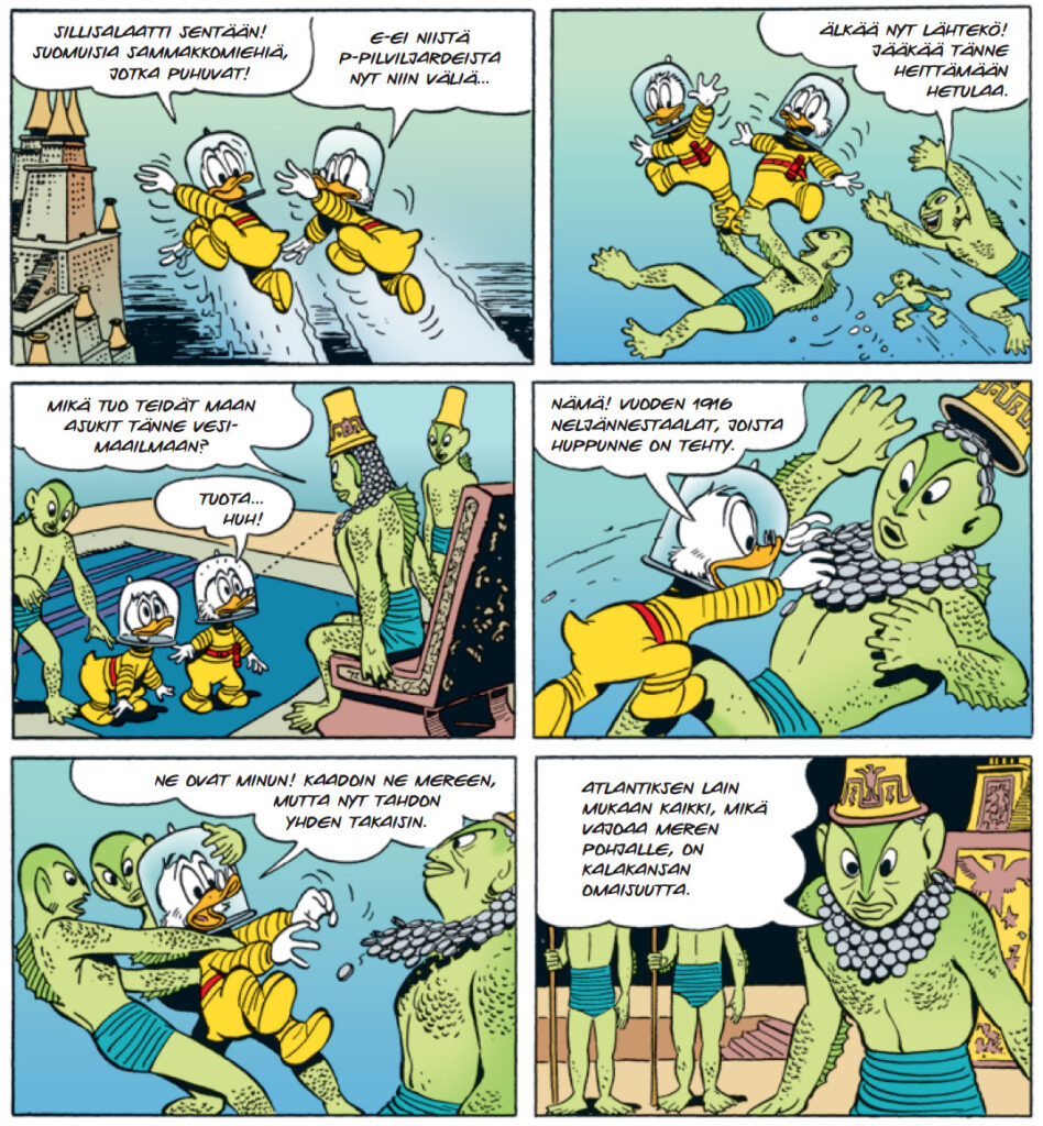 Parasta tässä tarinassa tosin on eeppinen piirakkataistelu. Siinä on menoa ja meininkiä Barksin pistäessä parastaan. Hervottoman hulinan ystäville tämä kohtaus toimii albumin huippukohtana. Sivumääränkin puolesta Atlantiksen arvoitus on tämän albumin ykkösjyrä.