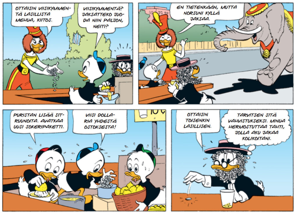 Kattauksen päättävässä tarinassa Mehukauppaa (The Lemonade Fling, 1963) Roope on elementissään, eli opettamassa rahan ja rehellisen kirjanpidon arvoa nuorisolle. Roope turvautuu siis valepukuun tarkkaillaakseen nuoria mehukappiaita, joille Aku hankkii asiakkaita kerrankin tekemisisssään onnistuen. Vaan kuka saakaan tarinan lopussa opetuksen? Ja kuinka monta lasillista mehua Roopeen mahtuu?
