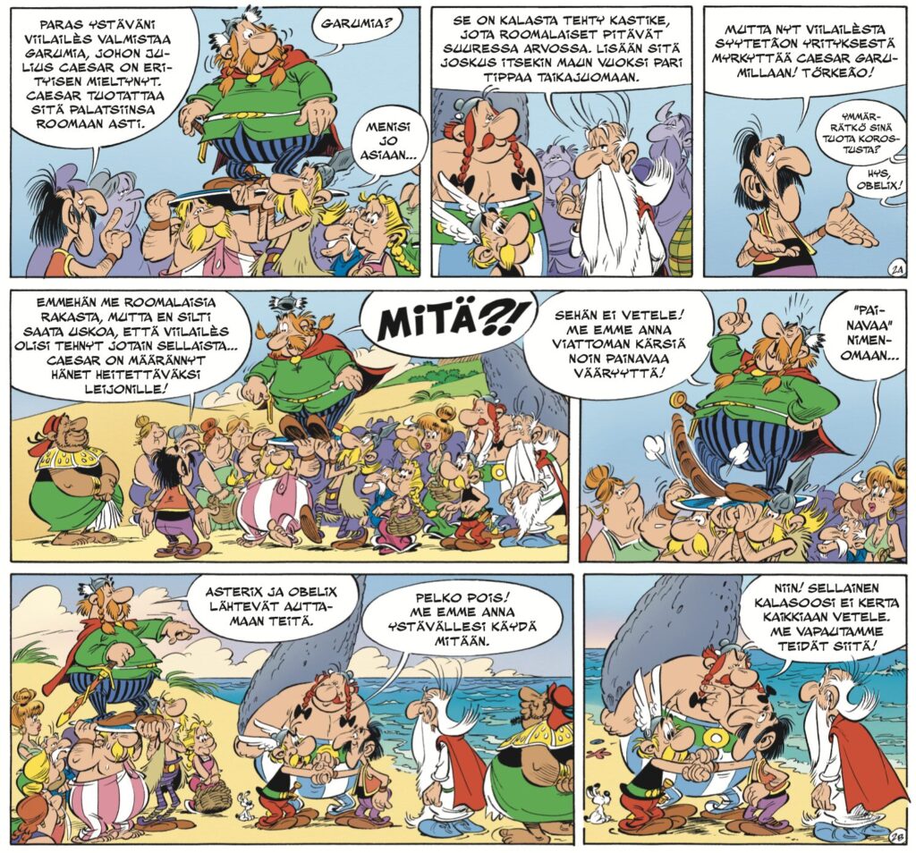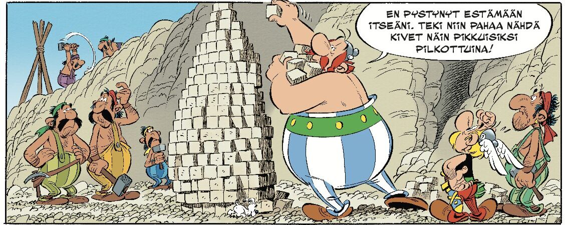 Intertekstuaalisuuden ystäville Asterix Lusitaniassa riittää silmä- ja aivokarkkia, eli bongattavaa piisaa: historian knoppitietoja, kuvataiteen klassikkoja, urheilutähtiä… Kääntäjät kautta maailman ovat olleet helisemässä tämänkin Asterixin kanssa. Oma Mirka Ulantommekaan ei ole päässyt helpolla. Jännityksellä odottelemme albumin saamaa palautetta.