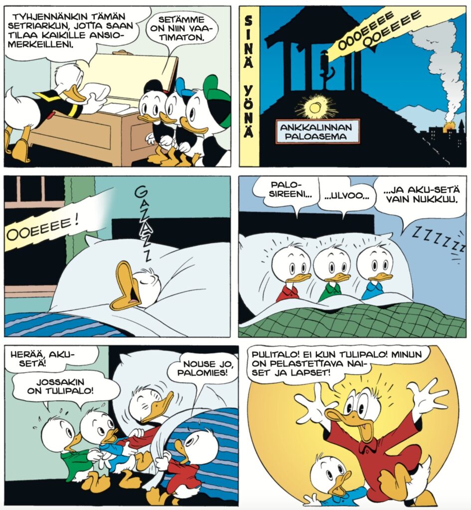 Aku Ankka palomiehenä (Fireman Donald) saattaa olla tämän albumin kirkkain helmi, mutta se toki on makuasia. Kaikki klassiset elementit ovat paketissa mukana: Akun hybris aiheuttaa kaaoksen ja pojat paikkaavat parhaansa mukaan. Barks ei anna Akulle armoa, eli kaikki mikä voi mennä pieleen menee pieleen ja pahasti. Antisankarin rooli on joskus raskas.
