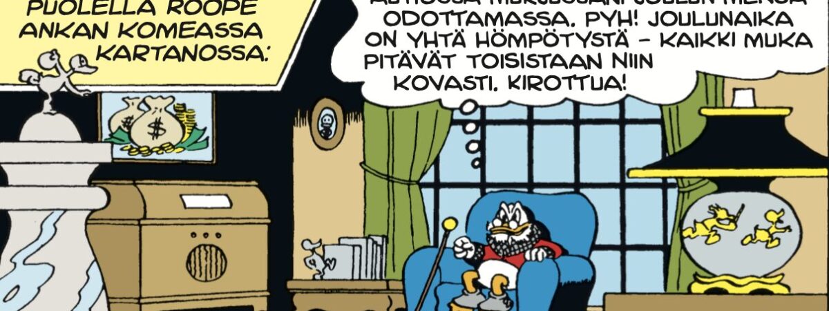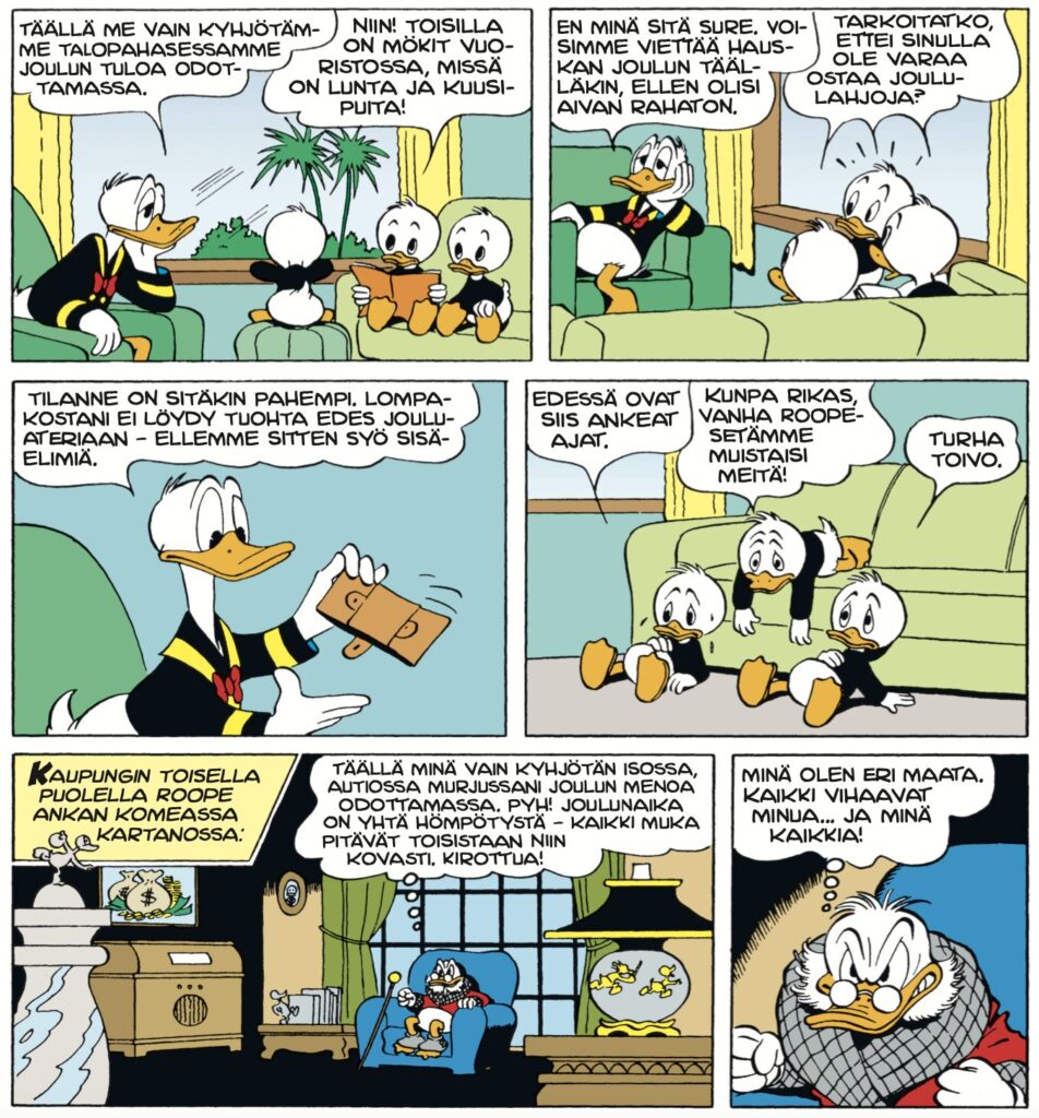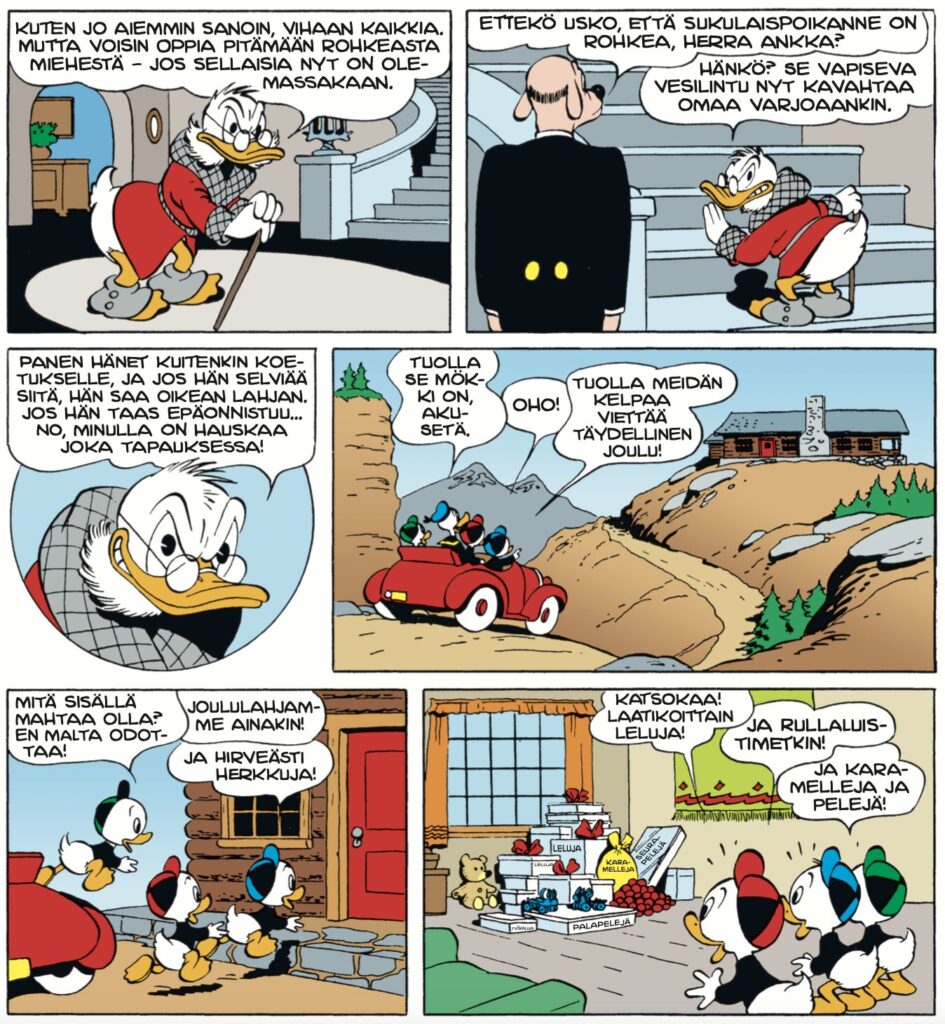 Tämän tarinan pyörteissä on helppo huomata Barksin tausta animaattorina – säntäilypainotteinen huumori takaa-ajoineen toimisi elävänäkin kuvana. Kuten kaikki tämän albumin tarinat, niin tämä jouluvelmuilu on vuodelta 1947. Se julkaistiin ensimmäisen kerran suomeksi vuonna 1958.