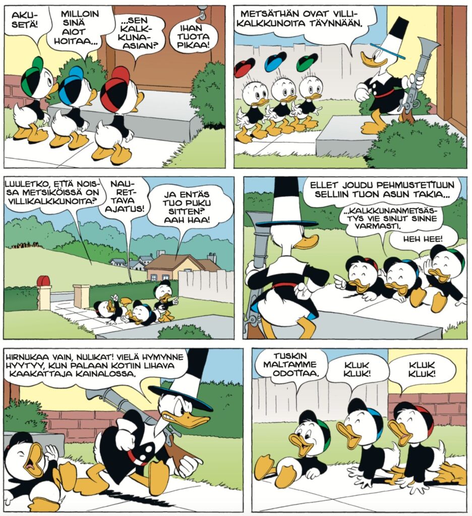 Aku Ankka kalkkunan jäljillä (The Terrible Turkey) päättää tämän kattauksen. Kiitospäivän kunniaksi taiteiltu tarina ei täällä niin lyö kipinää, koska kyseinen juhlapyhä herkkuineen on meikäläisittäin kovin vieras. Lopputulemana on melko suoraviivainen kalkkunajahti, jonka myötä Barks osoittaa jälleen kerran olevansa mieluummin saaliin kuin metsästäjän puolella. Loppuhuipennus lässähtää pahasti. Tai oikeastaan se iskee kiveen. Barksin huumori on kestänyt ajan hammasta uskomattoman hyvin, sillä näin hämmentävät hetket ovat todella harvassa.